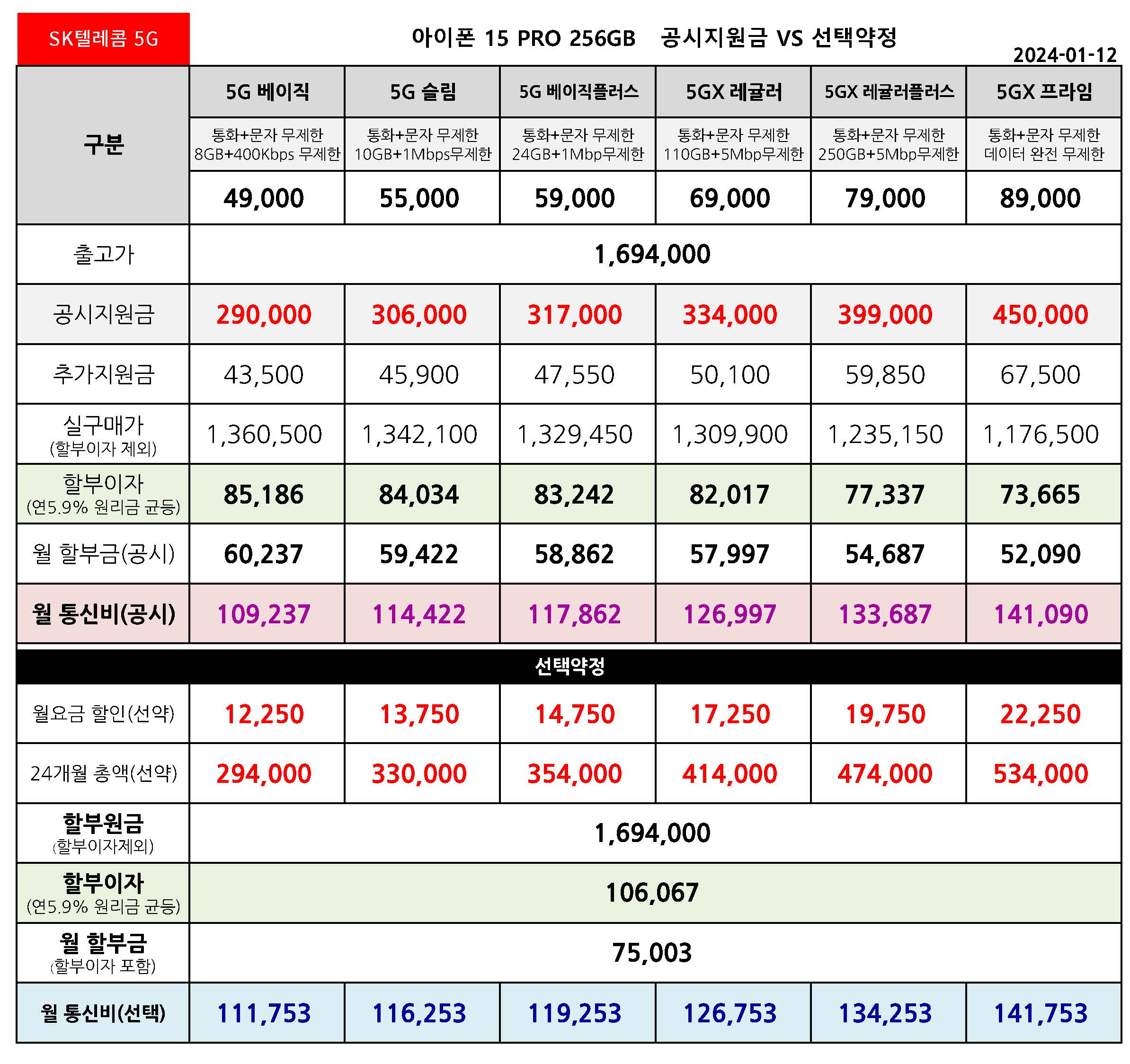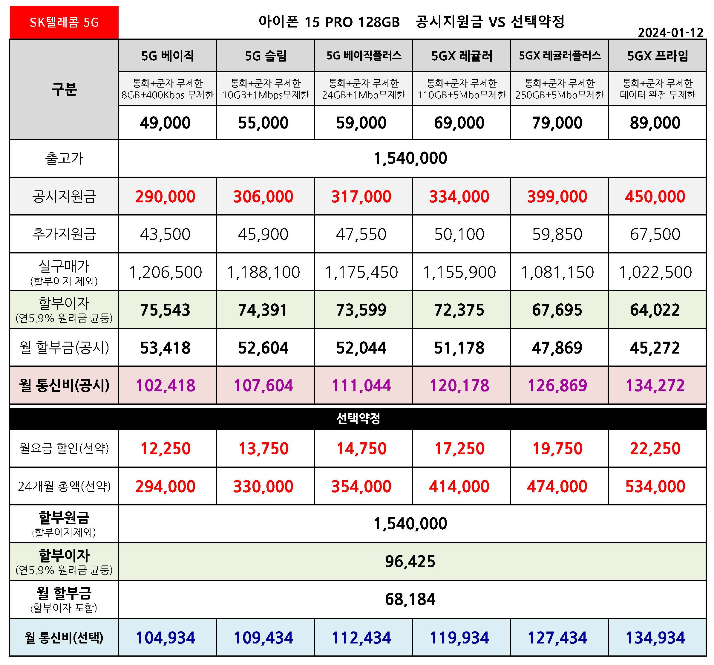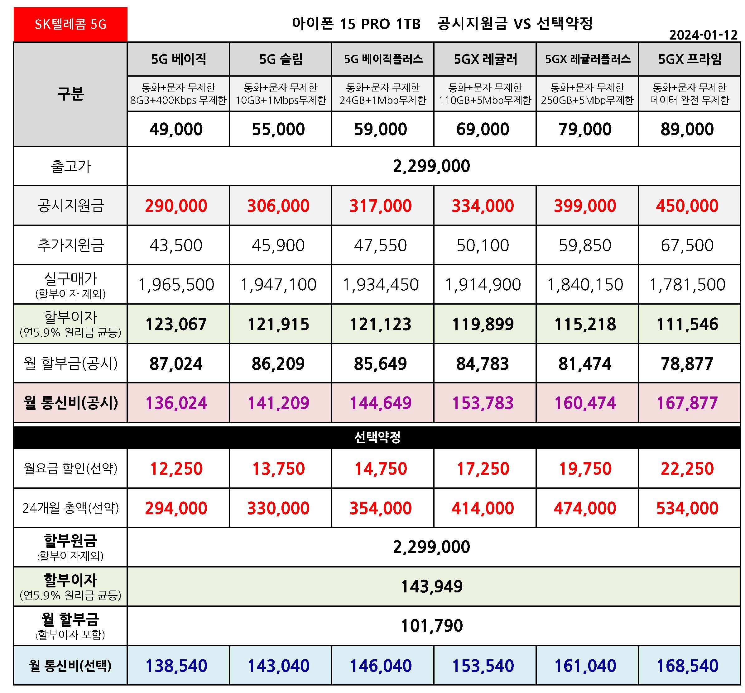 SK텔레콤 아이폰 15 프로 128/256/512/1TB 공시지원금 월 통신 요금표 - 1월 12일 기준