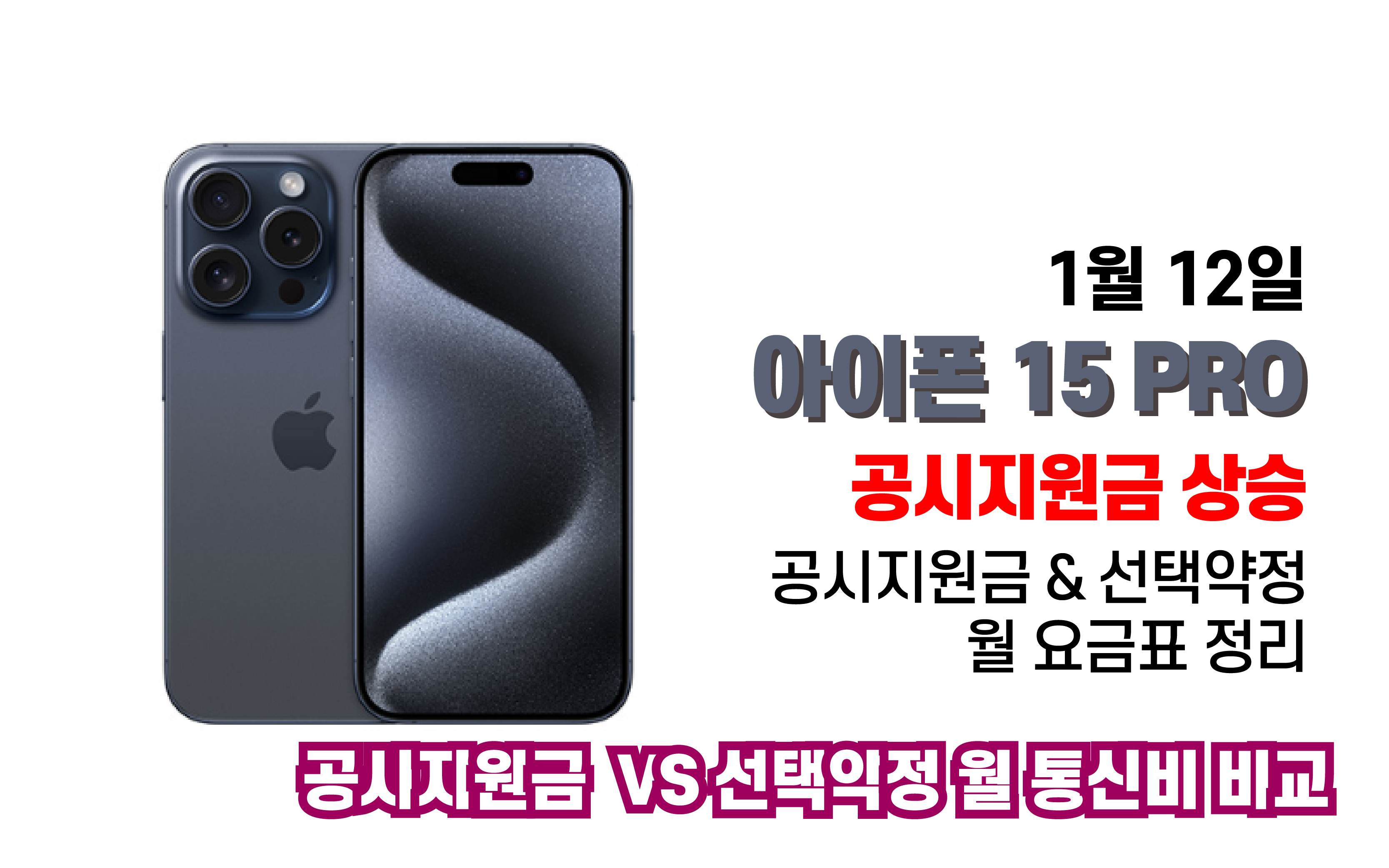 1월 아이폰 15 프로 공시지원금 상승 월 통신요금표 - 구매참고용