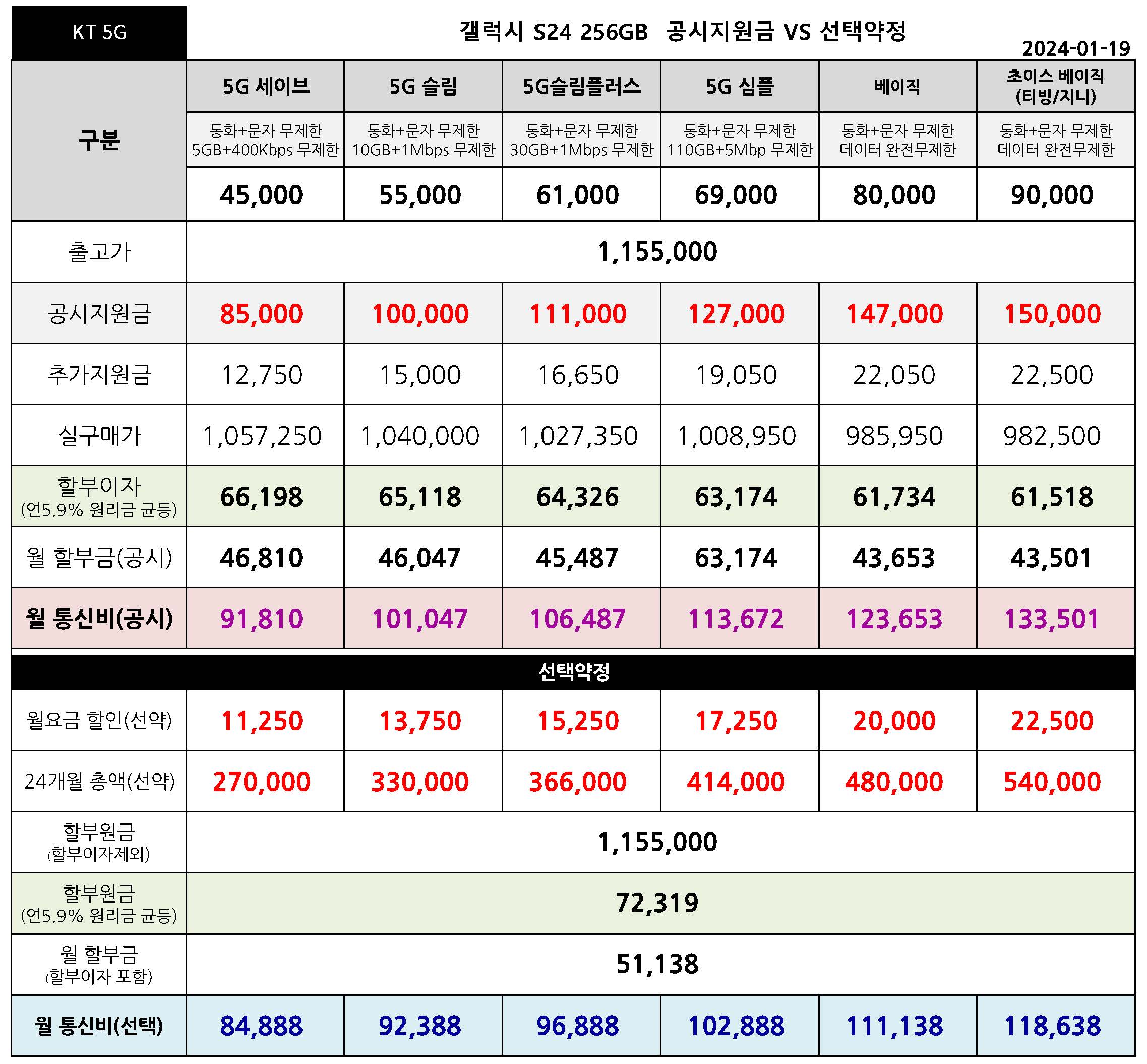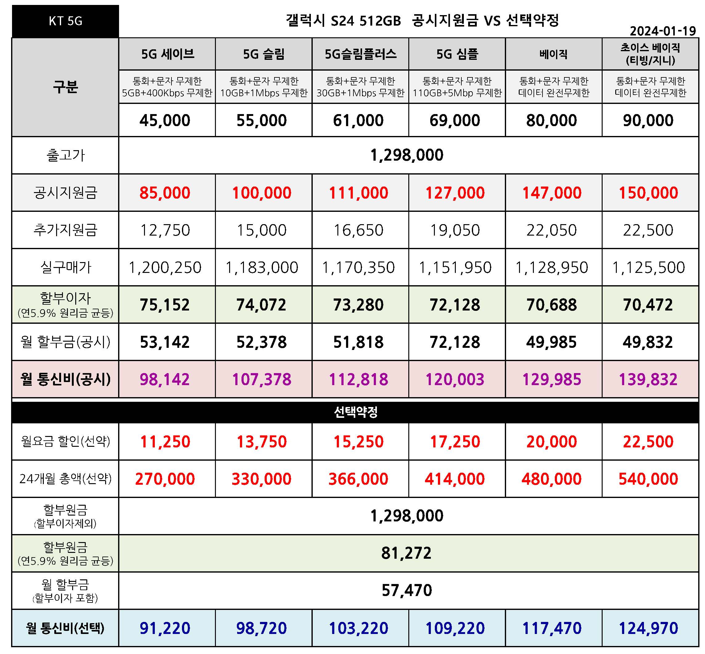 KT 갤럭시 S24 공시지원금 & 선택약정 월 통신요금표 - 1월 19일 기준