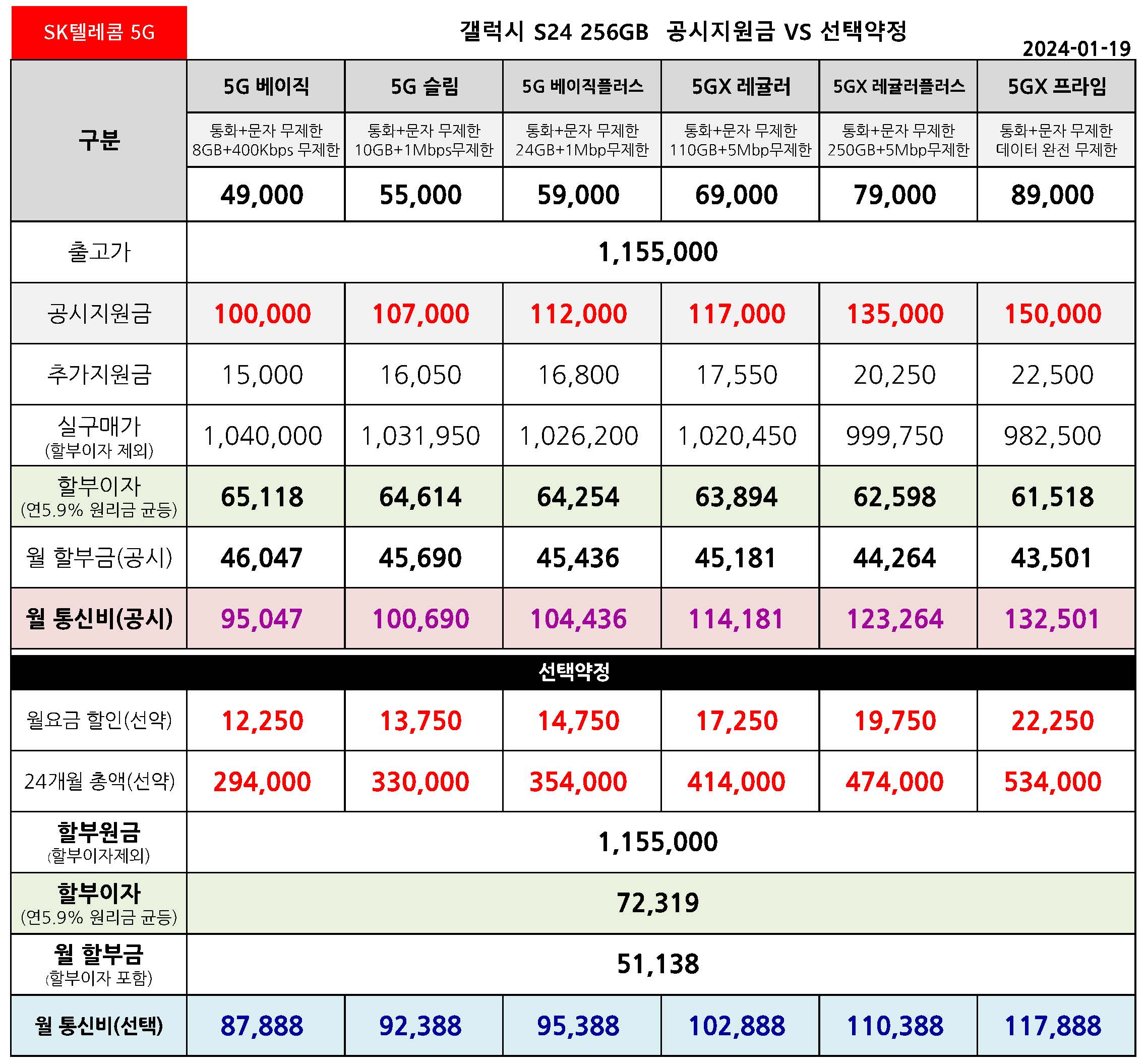 SK텔레콤 갤럭시 S24 공시지원금 & 선택약정 월 통신요금표 - 1월 19일 기준