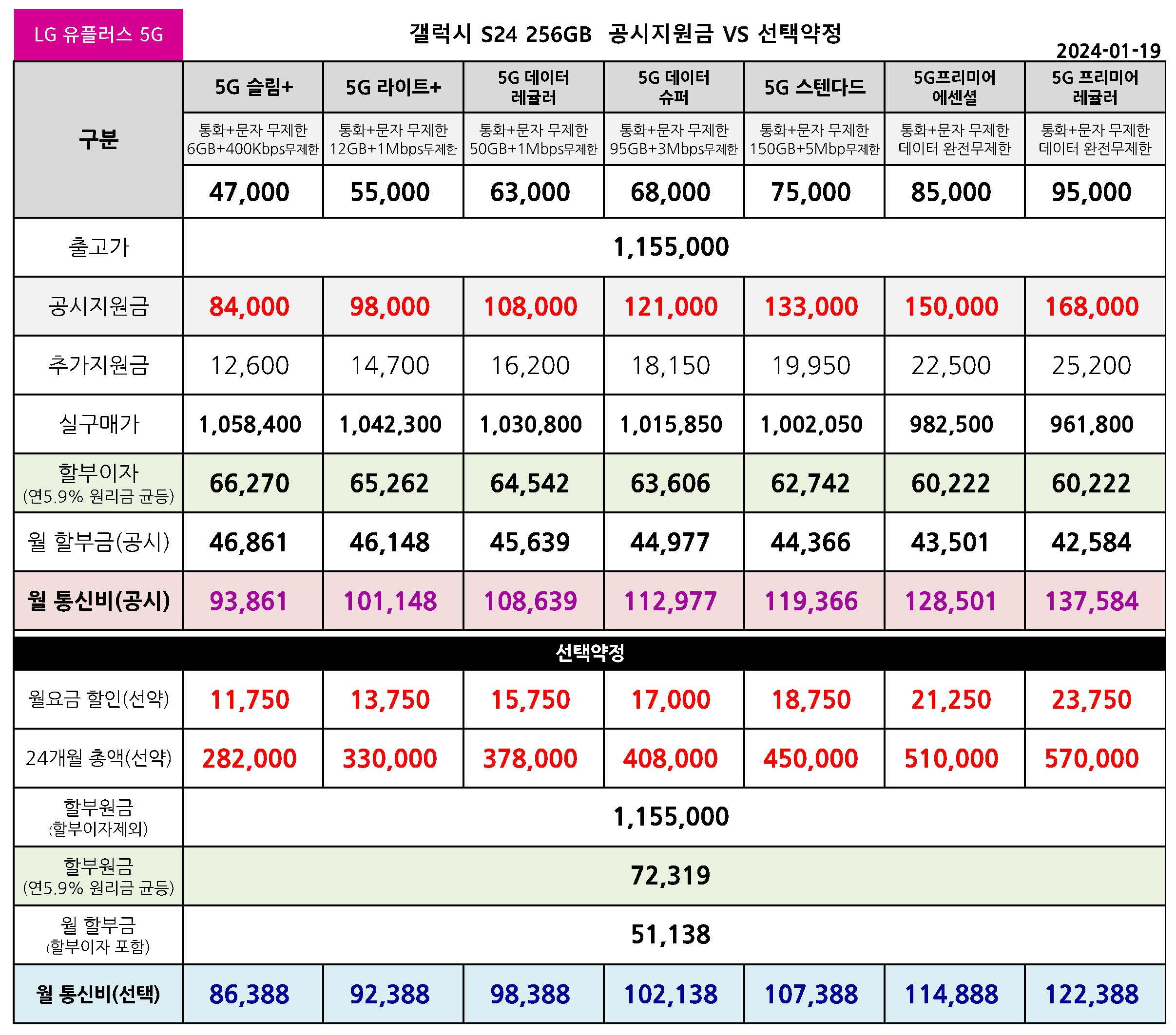 LG 유플러스 갤럭시 S24 공시지원금 & 선택약정 월 통신요금표 - 1월 19일 기준