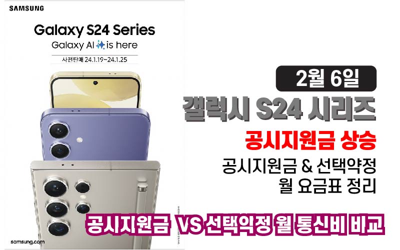 갤럭시 S24 시리즈 공시지원금 상승 공시&선약 월 통신요금 비교표 - 2월6일