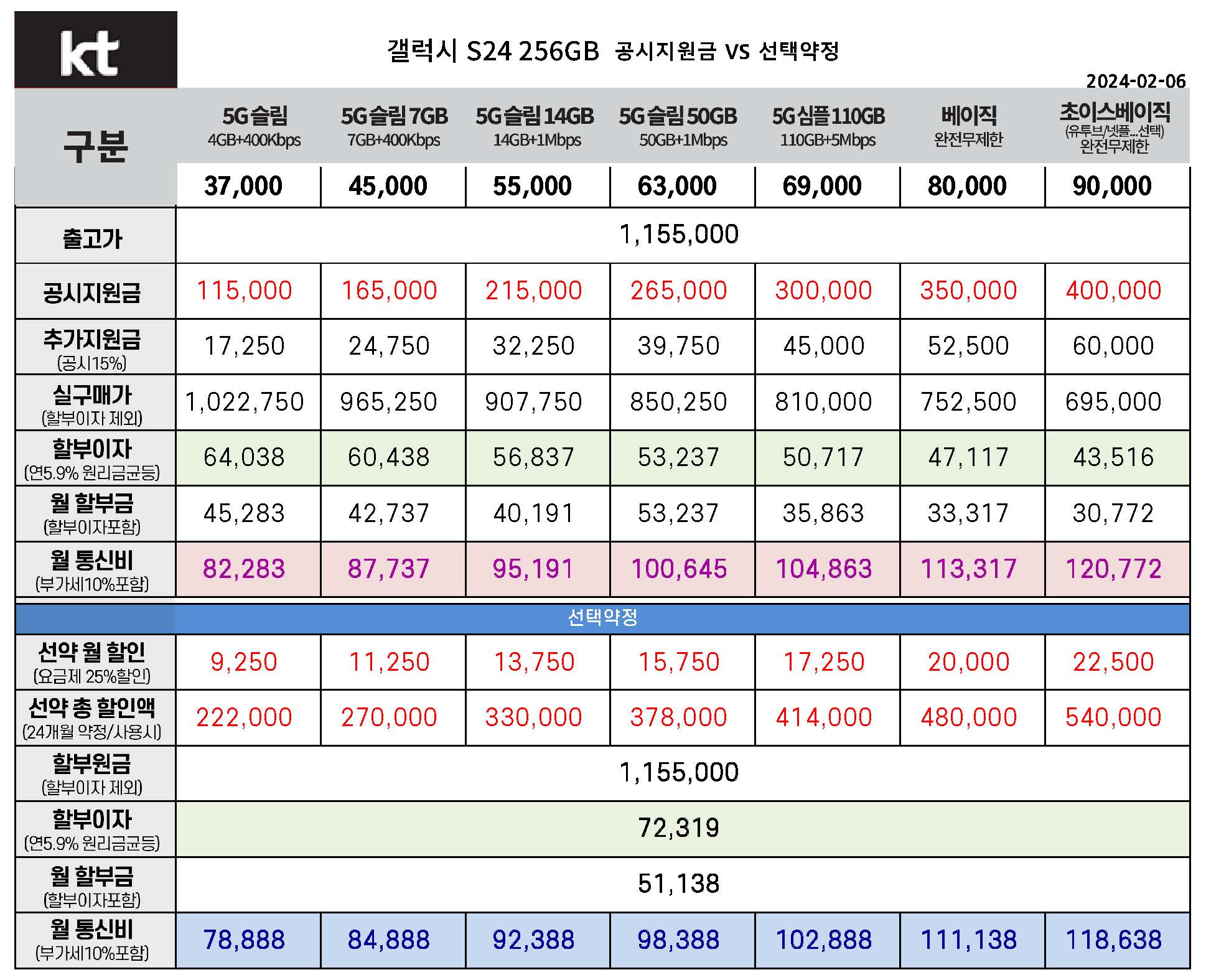 KT 갤럭시 S24 공시지원금 & 선택약정 월 통신비 요금표 비교