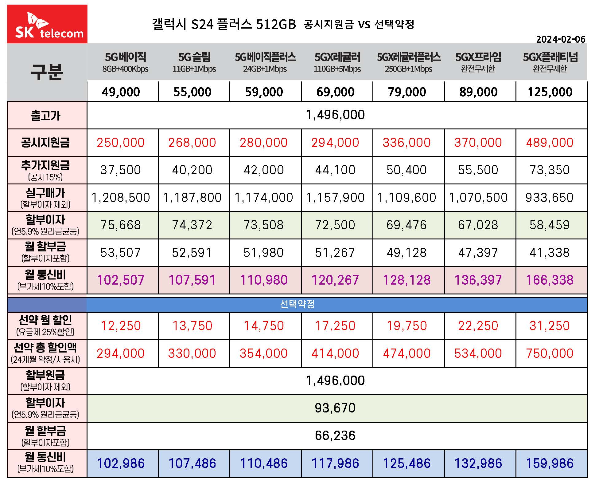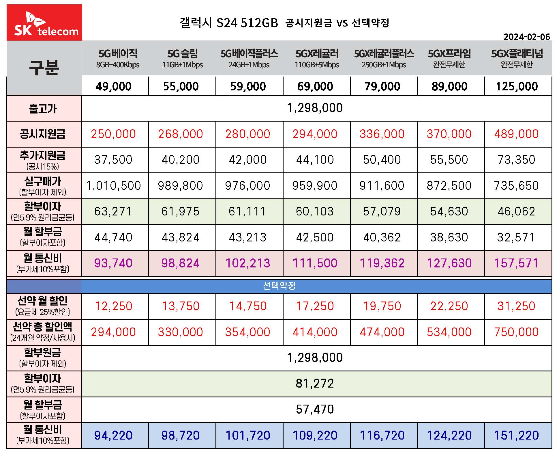 SK텔레콤 갤럭시 S24 공시지원금 & 선택약정 월 통신비 요금표 비교