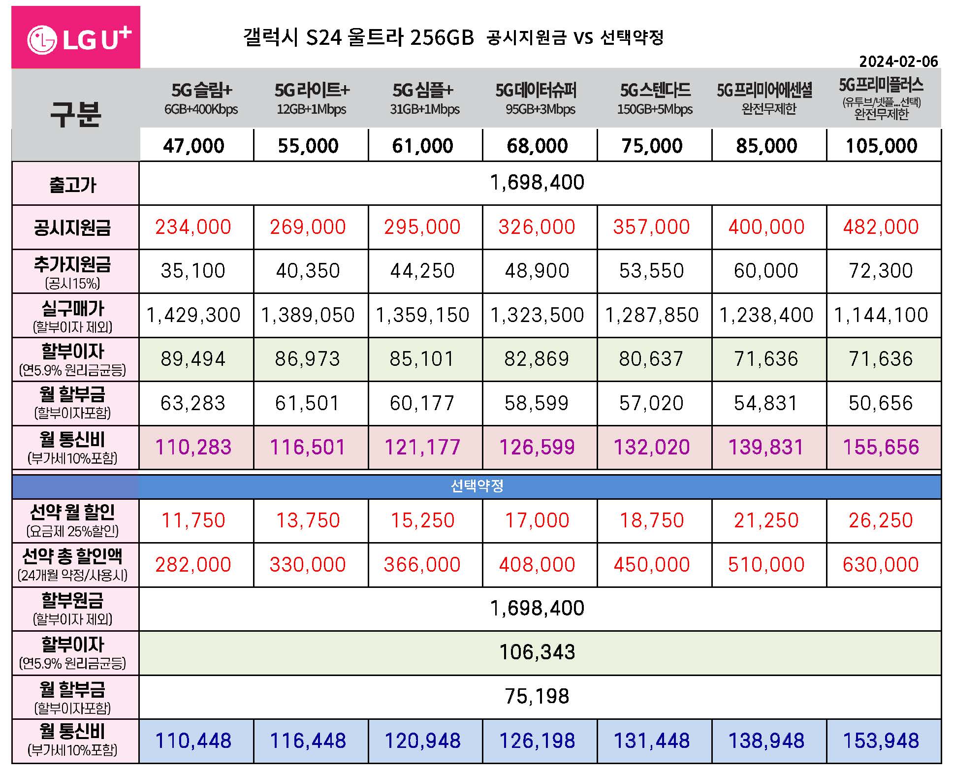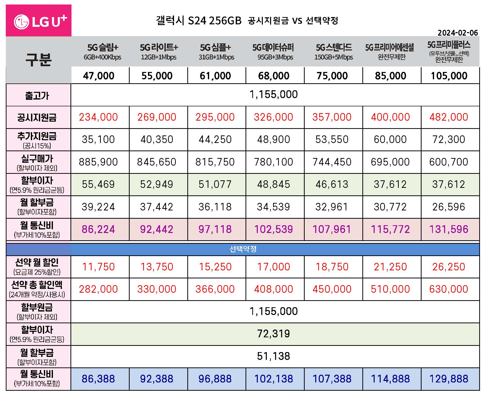 LG유플러스 갤럭시 S24 공시지원금 & 선택약정 월 통신비 요금표 비교
