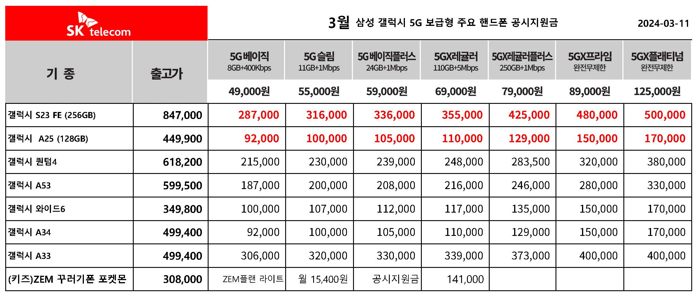 3월 11일 기준 SK텔레콤 3월 공시지원 변동 핸드폰은 없습니다.