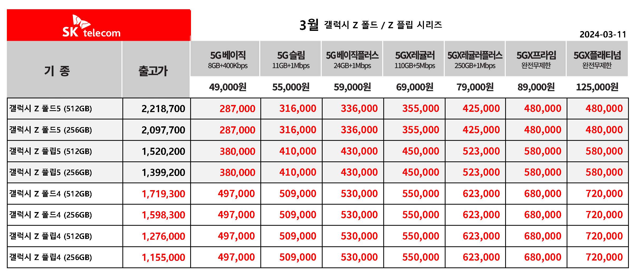 3월 SK텔레콤 갤럭시 Z 시리즈 공시지원금