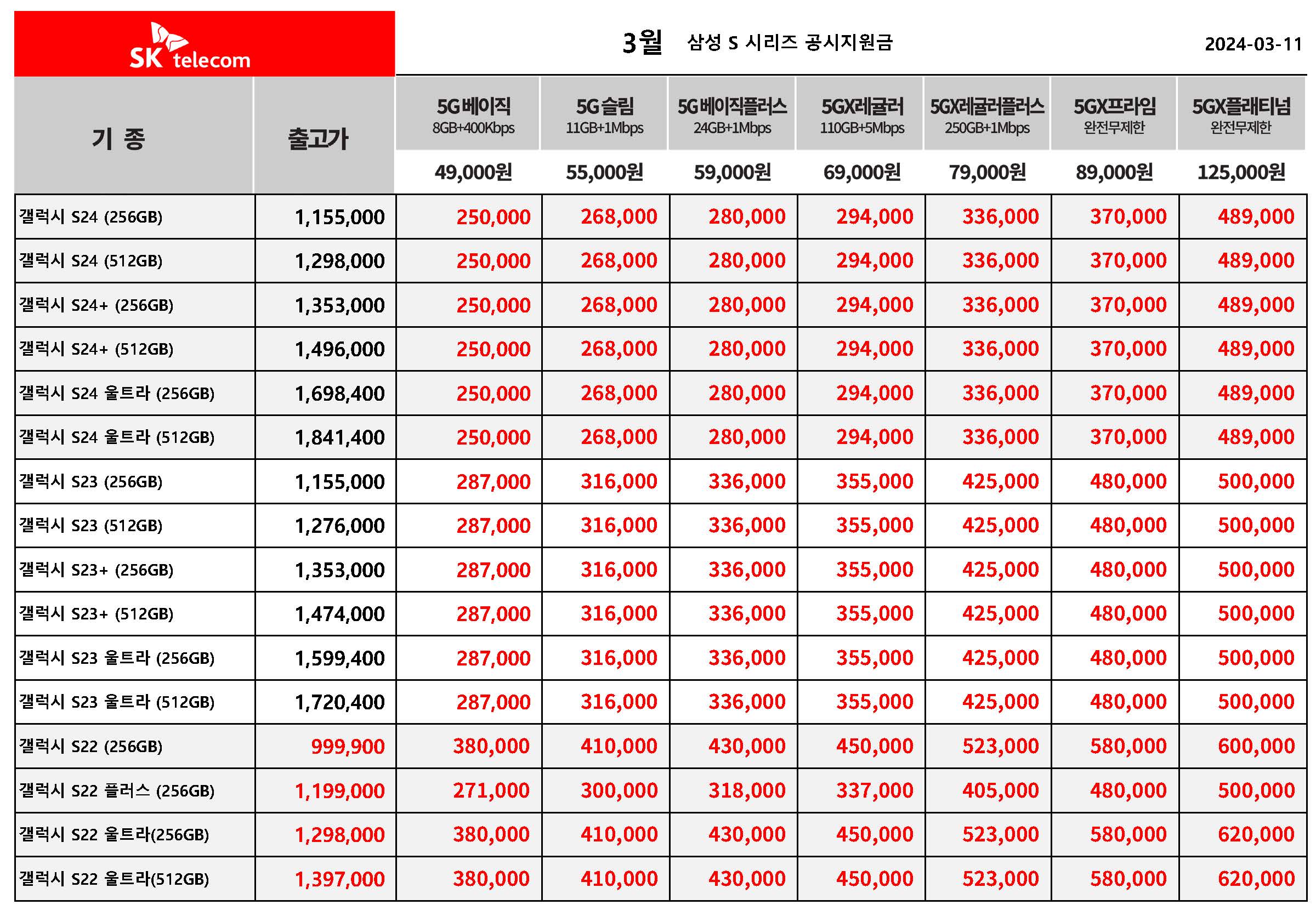 3월 SK텔레콤 갤럭시 S 시리즈 공시지원금