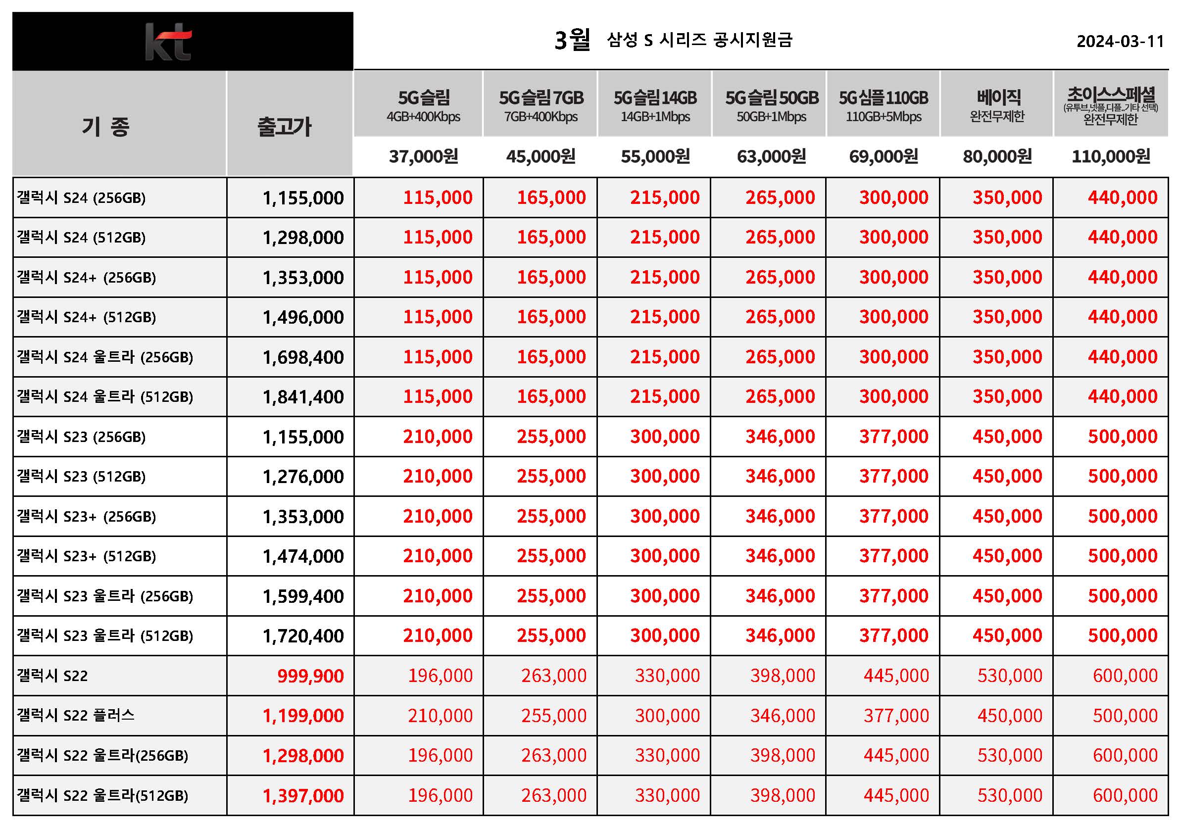 3월 KT 갤럭시 S 시리즈 공시지원금