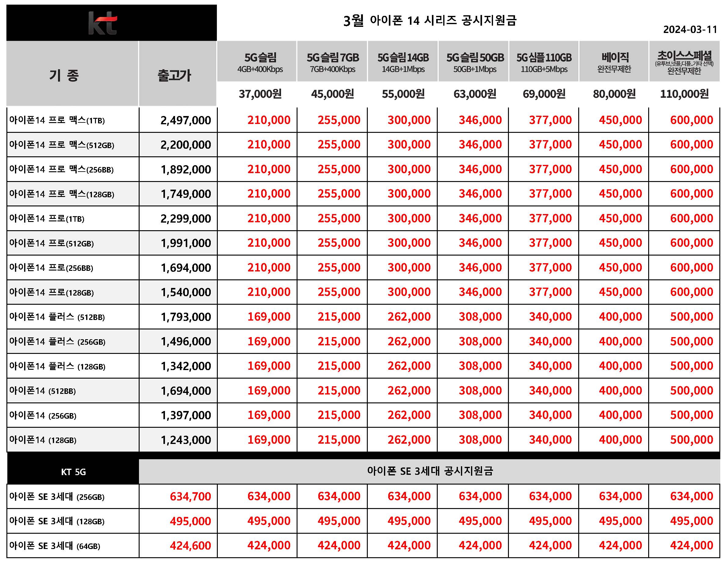 3월 KT 아이폰 14 시리즈 & 아이폰 SE 3세대 공시지원금