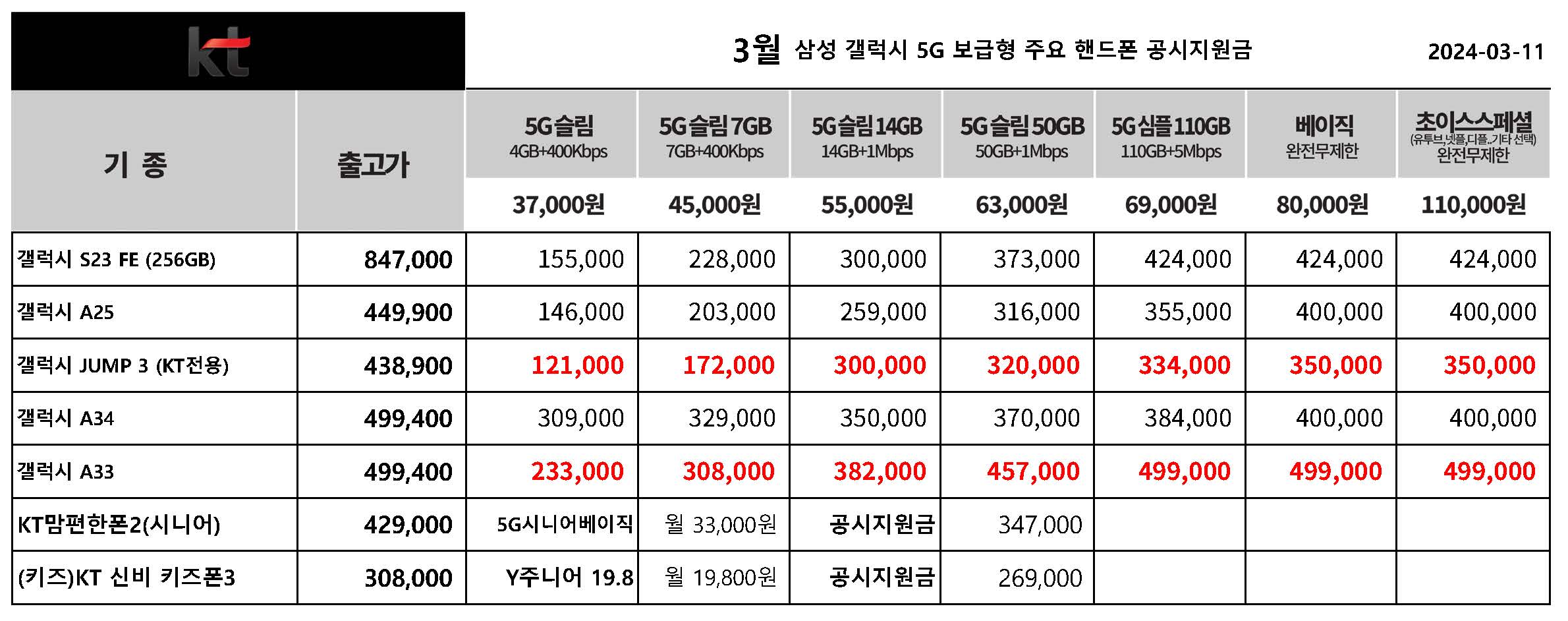 3월 KT 전용 휴대폰인 갤럭시 JUMP3의 공시지원금이 상승 하였습니다.