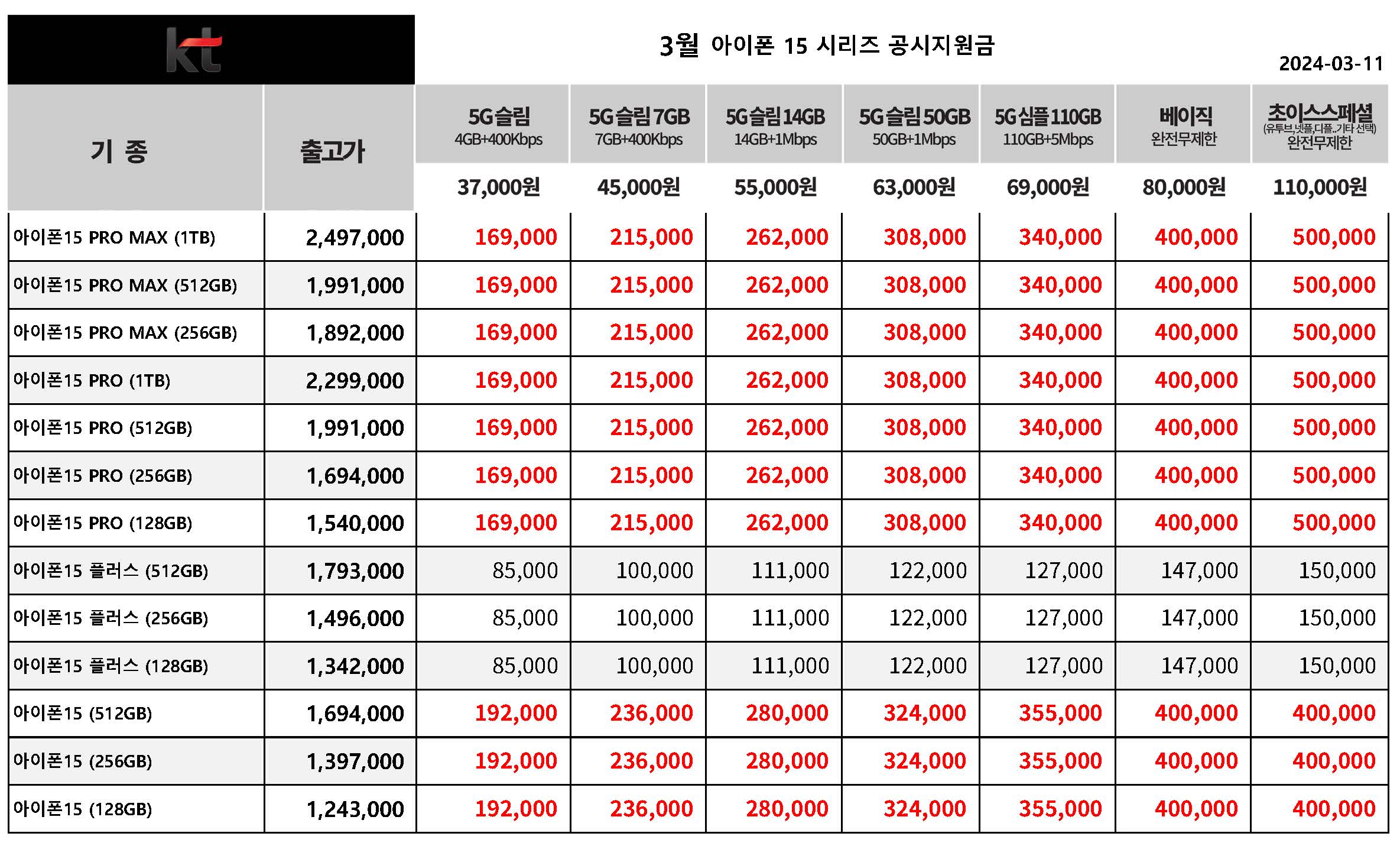 3월 KT 아이폰 15 시리즈 공시지원금