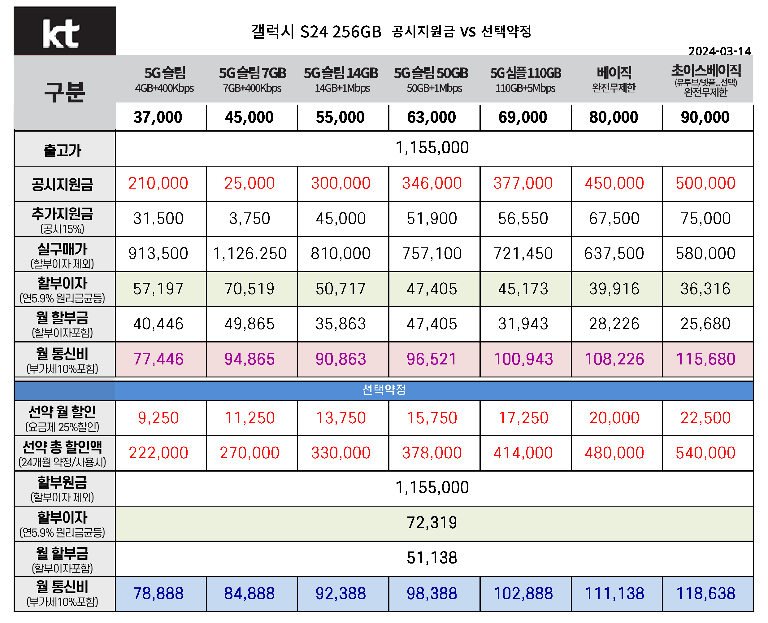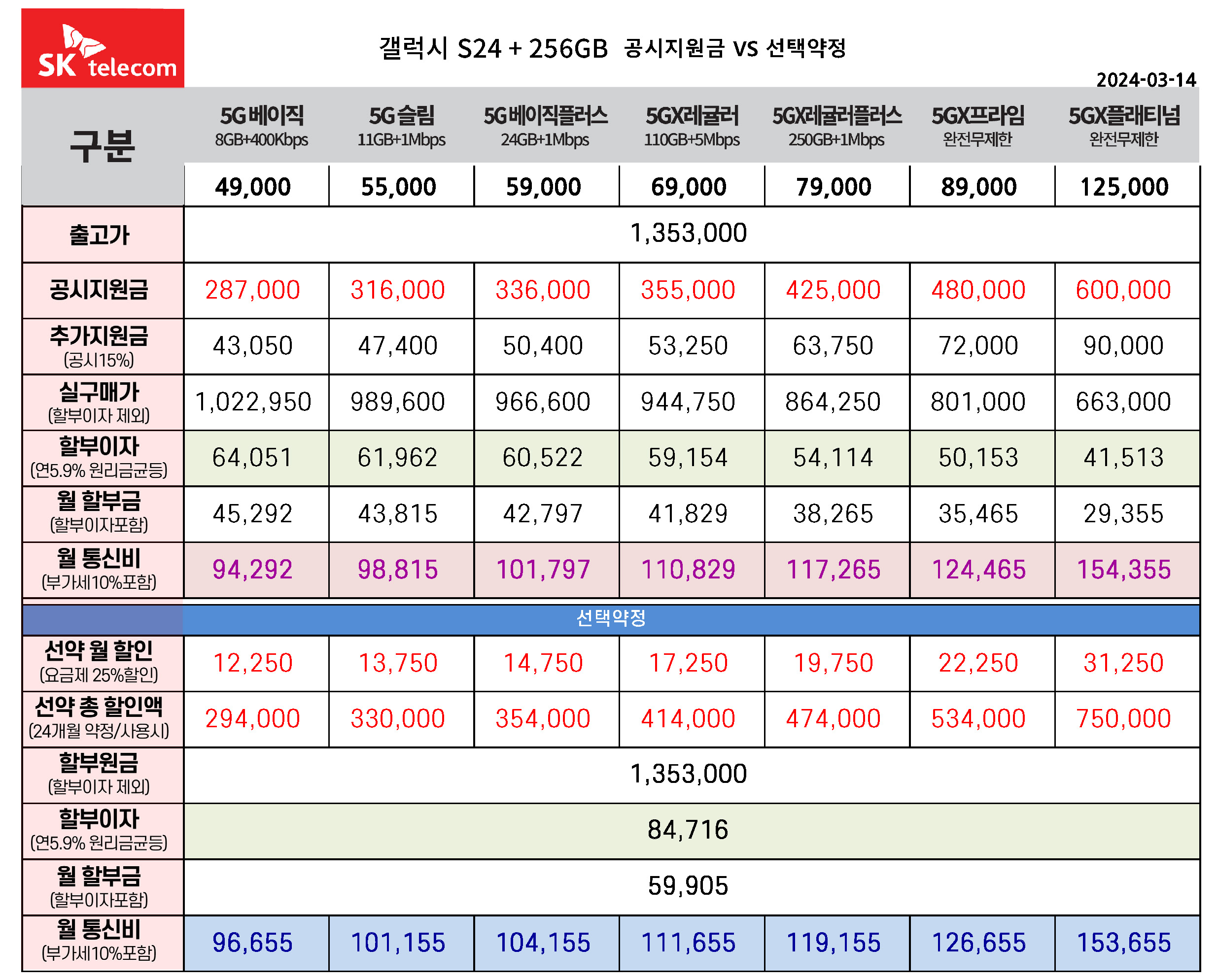갤럭시 S24 256기가 공시지원금 & 선택약정 월 통신요금 비교표