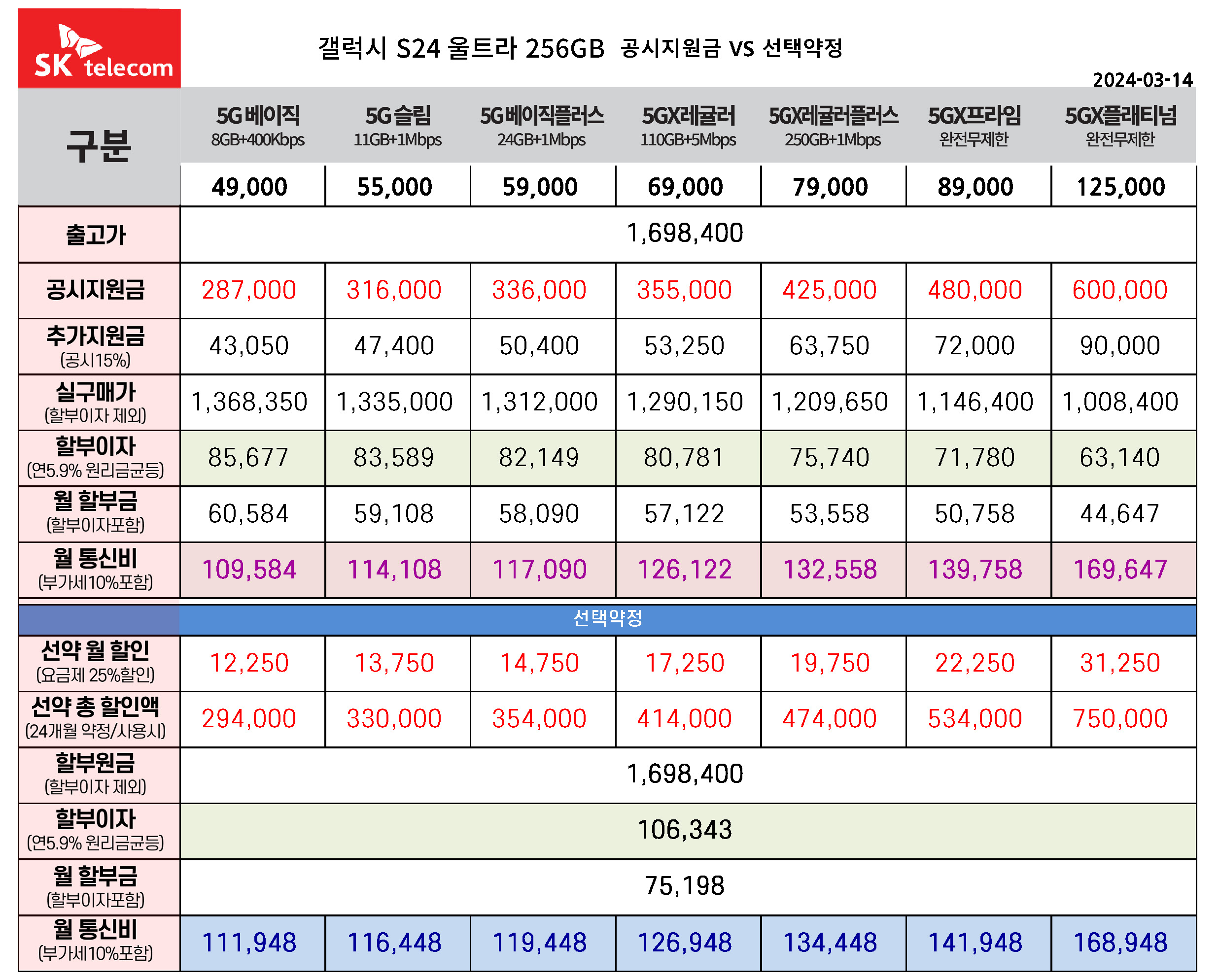 갤럭시 S24 울트라 256기가 공시지원금 & 선택약정 월 통신요금 비교표