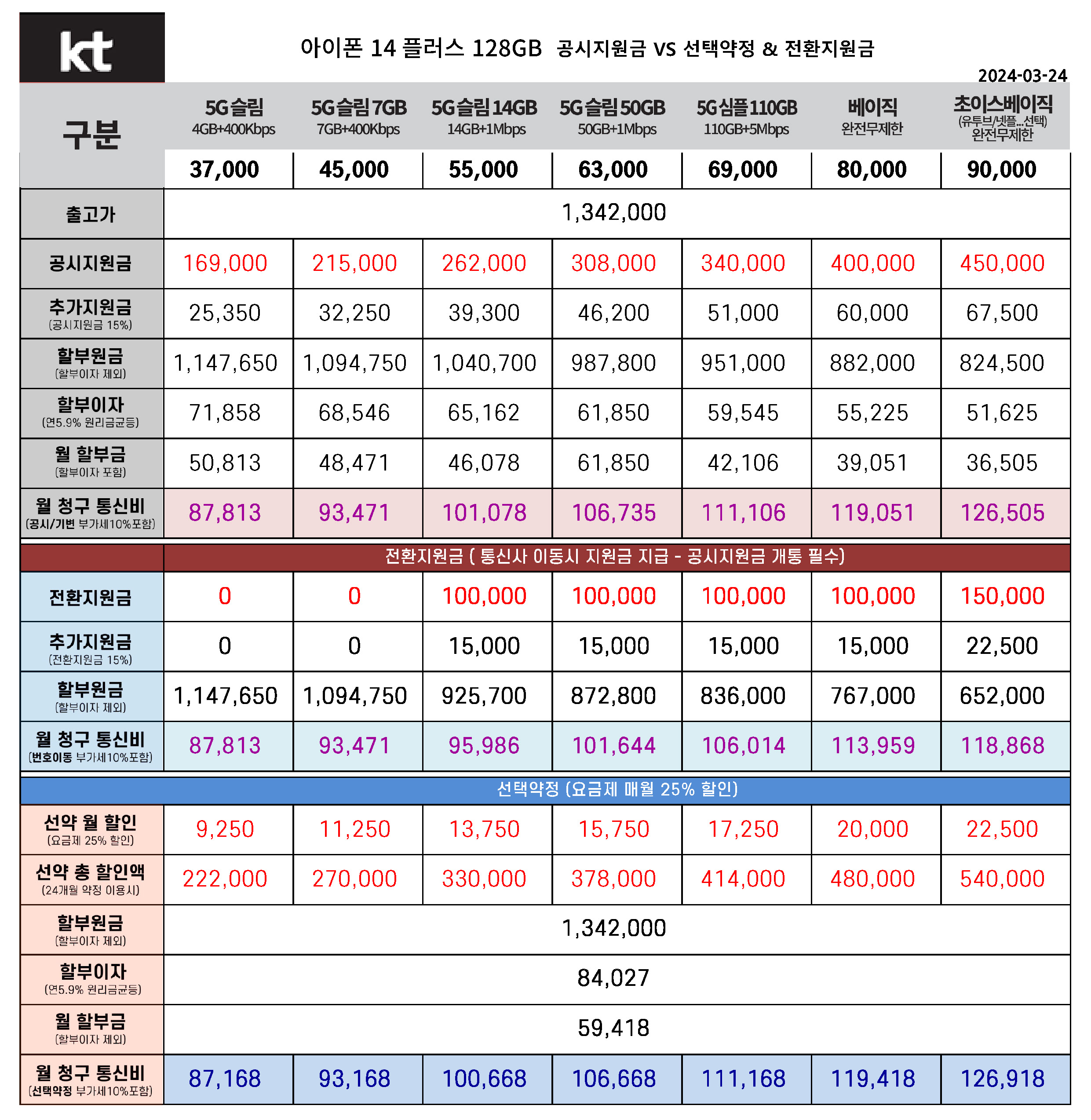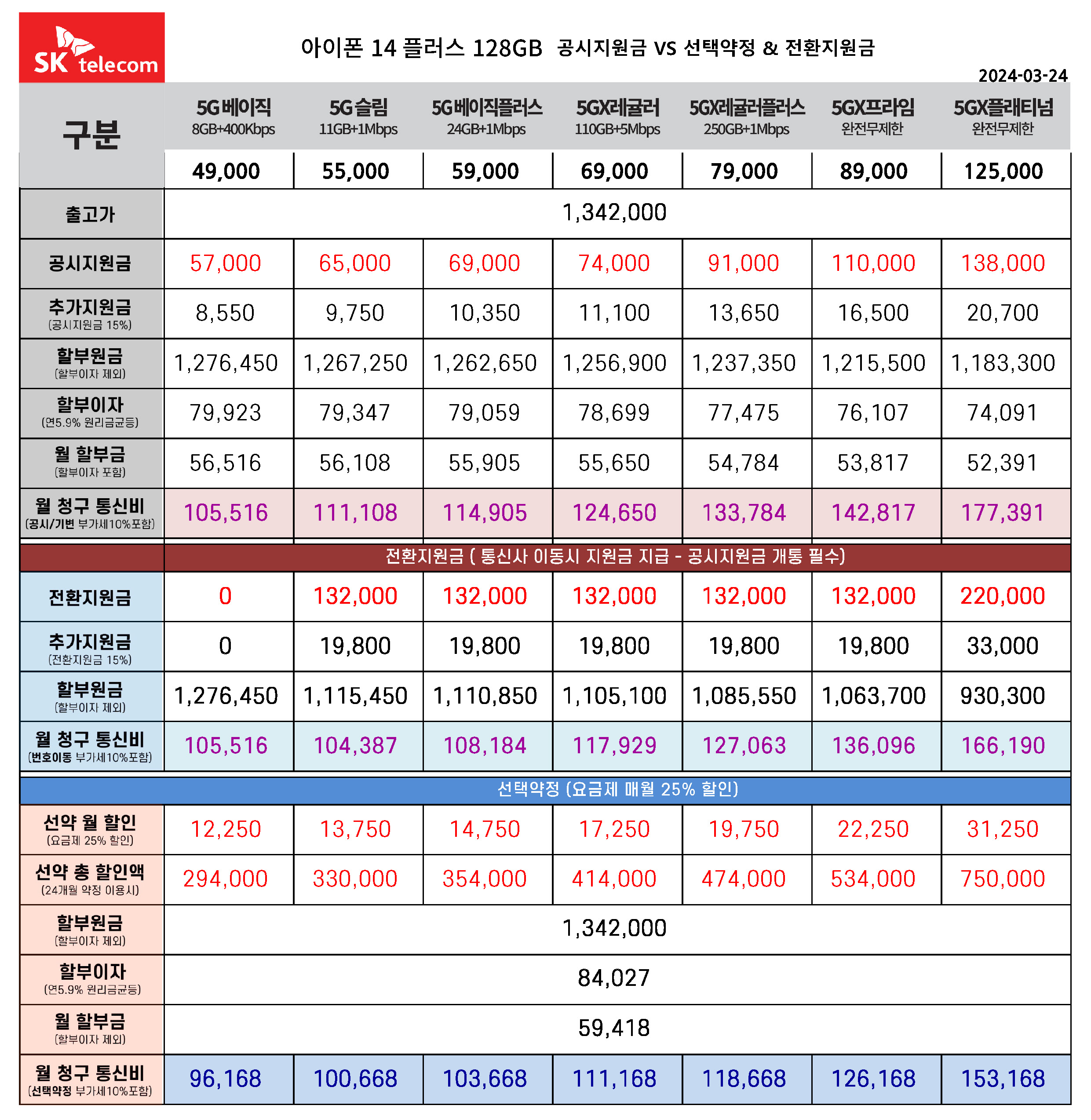 아이폰 14 플러스 128기가 공시지원금 & 선택약정 & 전환지원금(번호이동) 통신비 요금표 비교