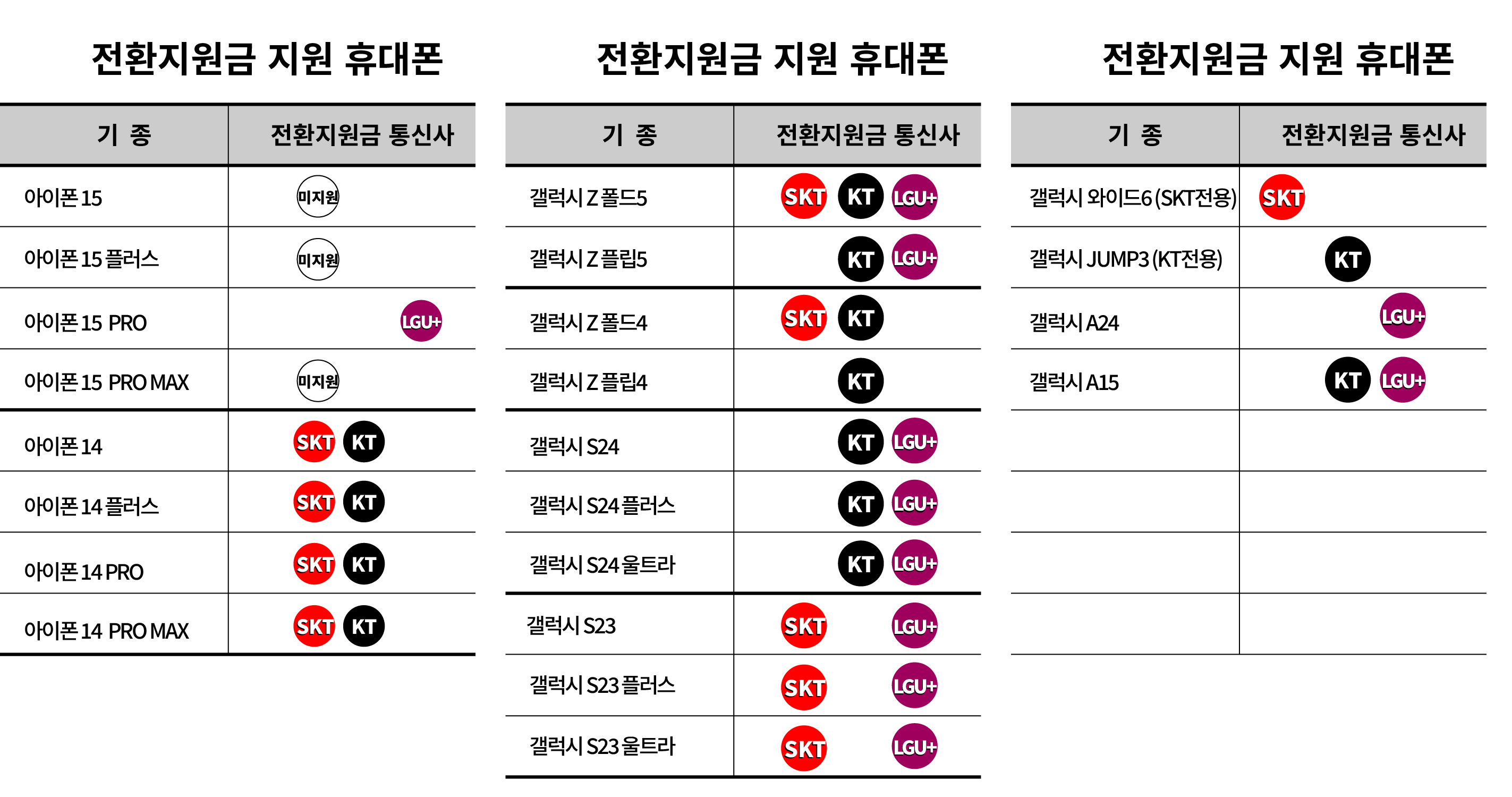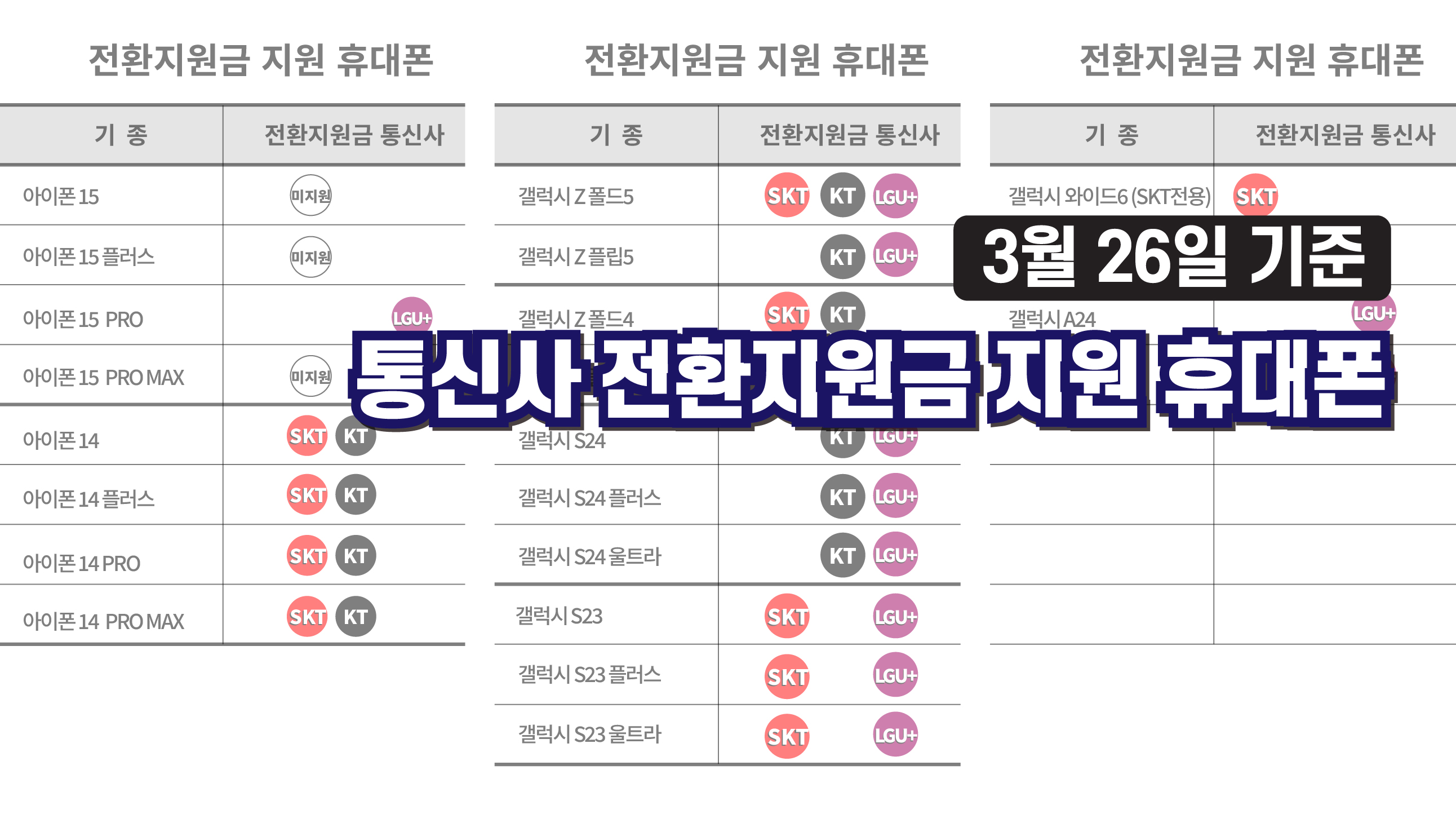 3월 26일 기준 통신사 휴대폰 전환지원금 요약표 입니다.