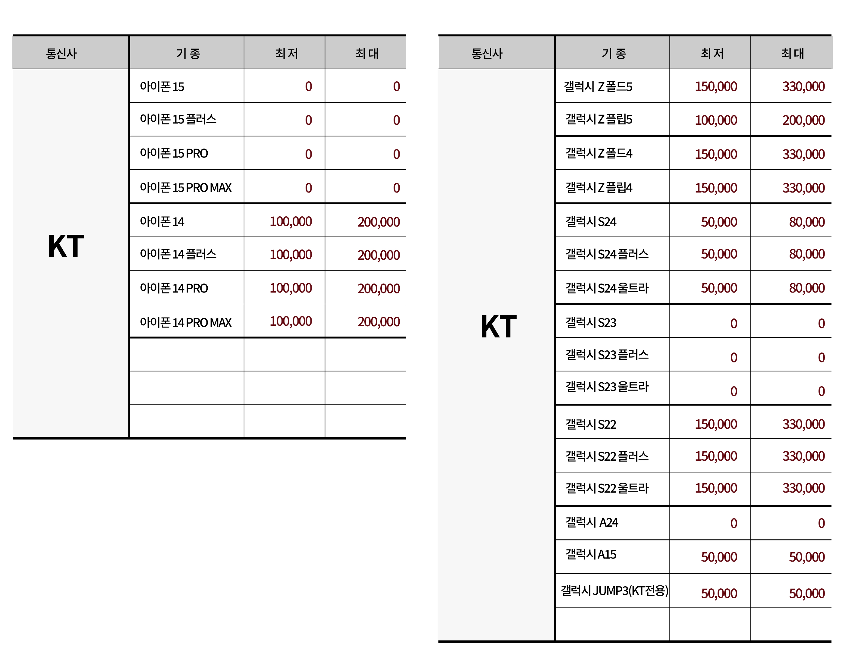 - 갤럭시 Z 시리즈, S시리즈 전기종  최저 요금제 55,000원 - 최대 130,000원