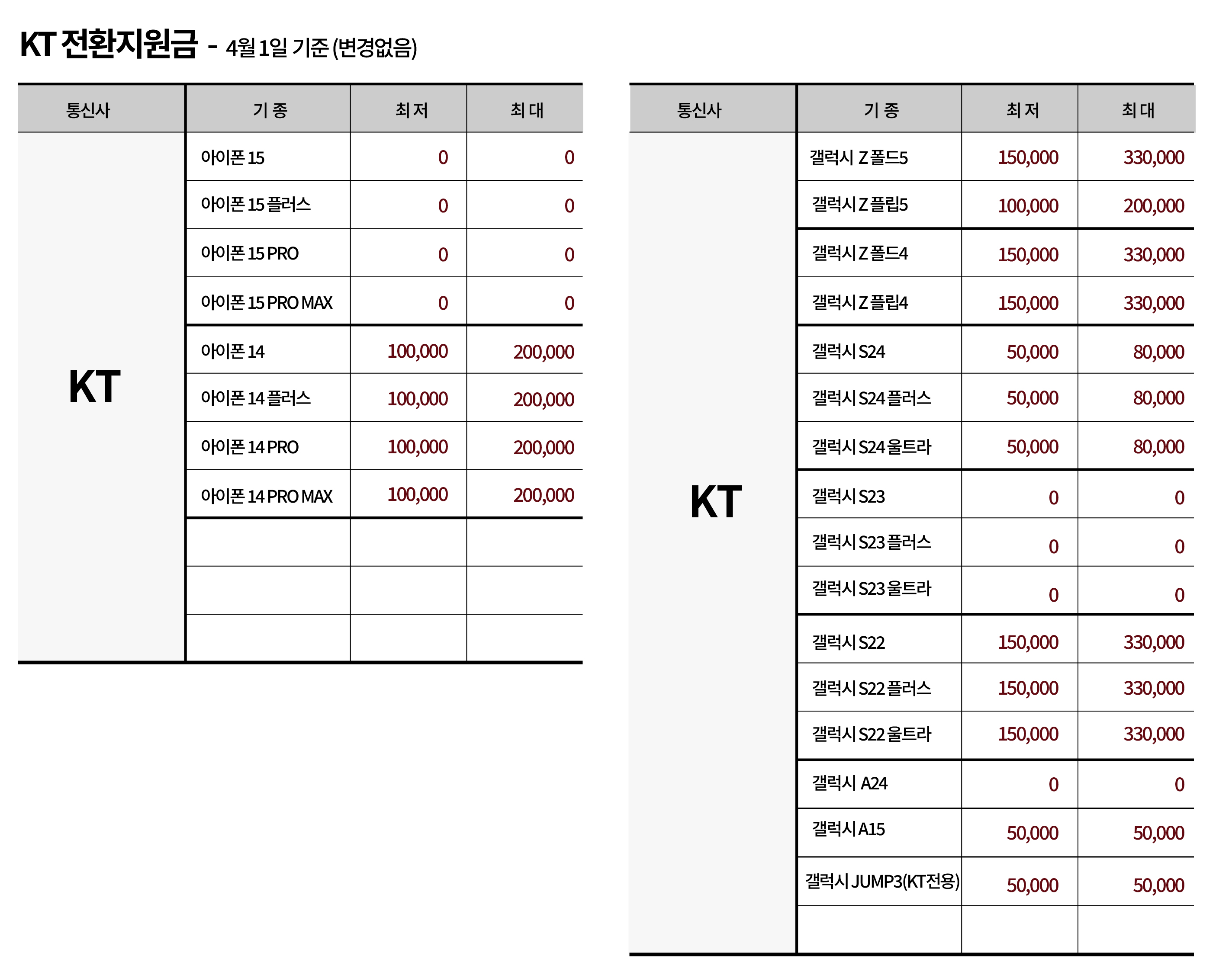 KT 번호이동 전환지원금 - 4월 1일 기준
