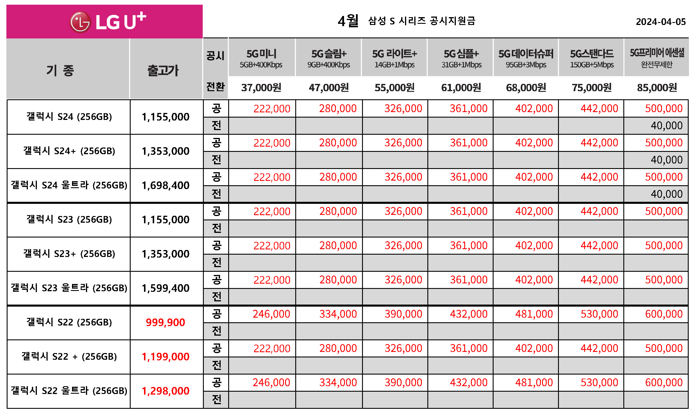 4월 LG 유플러스 갤럭시 S 시리즈 공시지원금 & 전환지원금