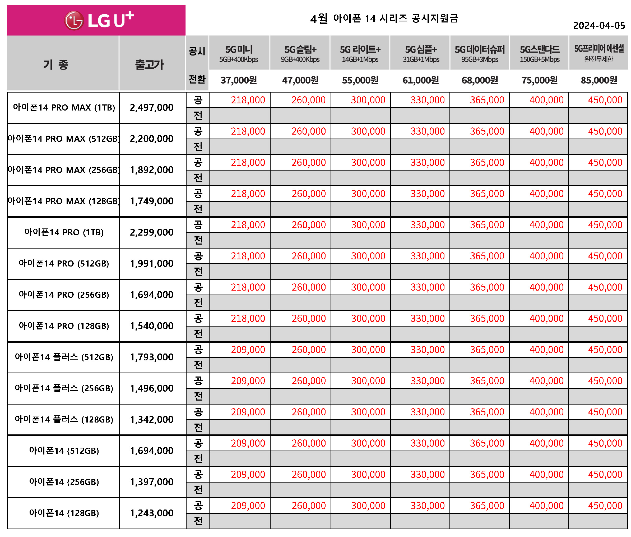 4월 LG유플러스 주요 핸드폰 공시지원금 & 전환지원금 정리 - 4월5일 기준