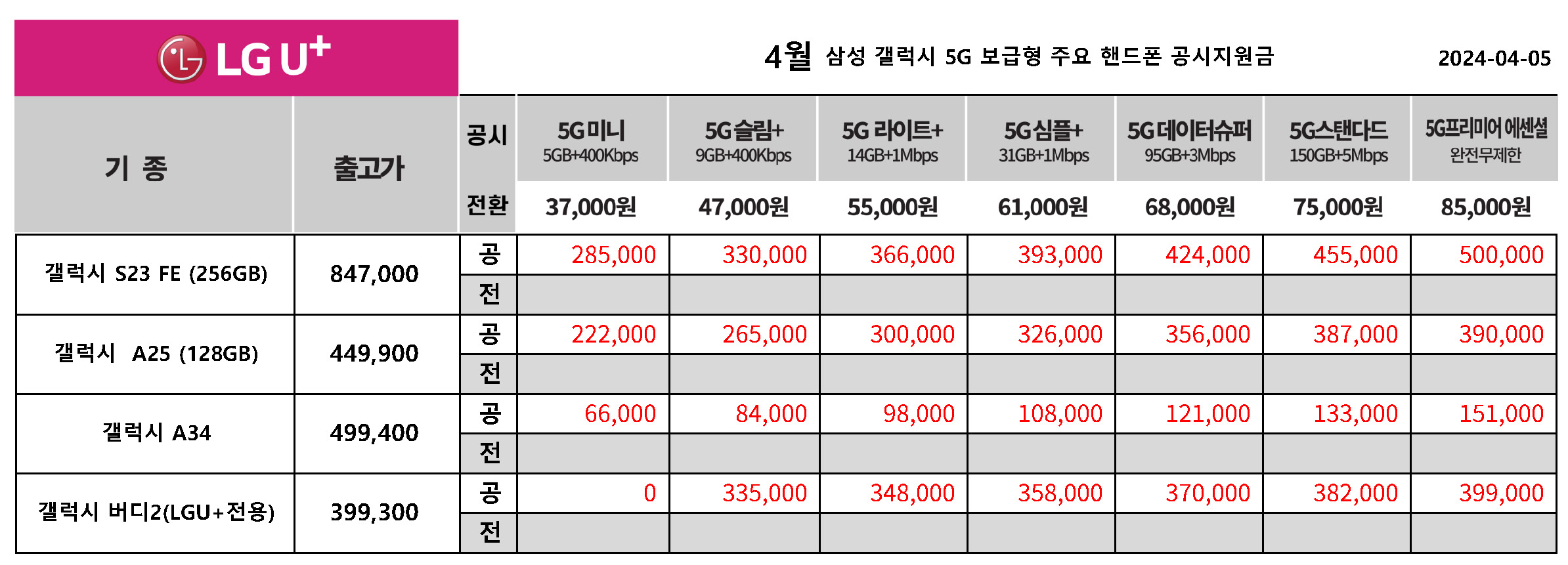 4월 LG 유플러스 갤럭시 보급형 휴대폰 공시지원금 & 전환지원금