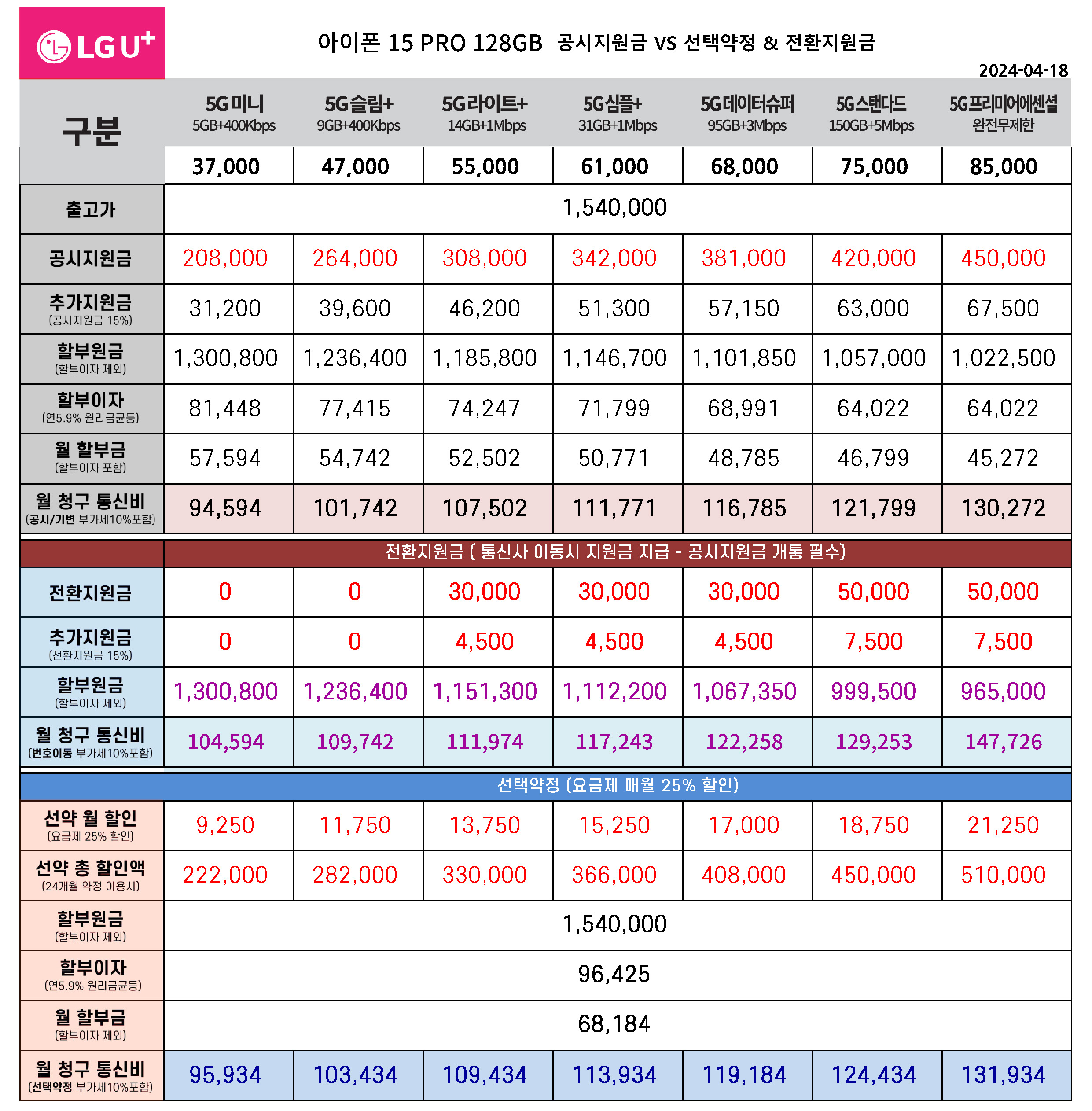 아이폰 15 PRO 128GB 공시지원금 & 전환지원금, 선택약정 요금표 - 4월 18일 기준