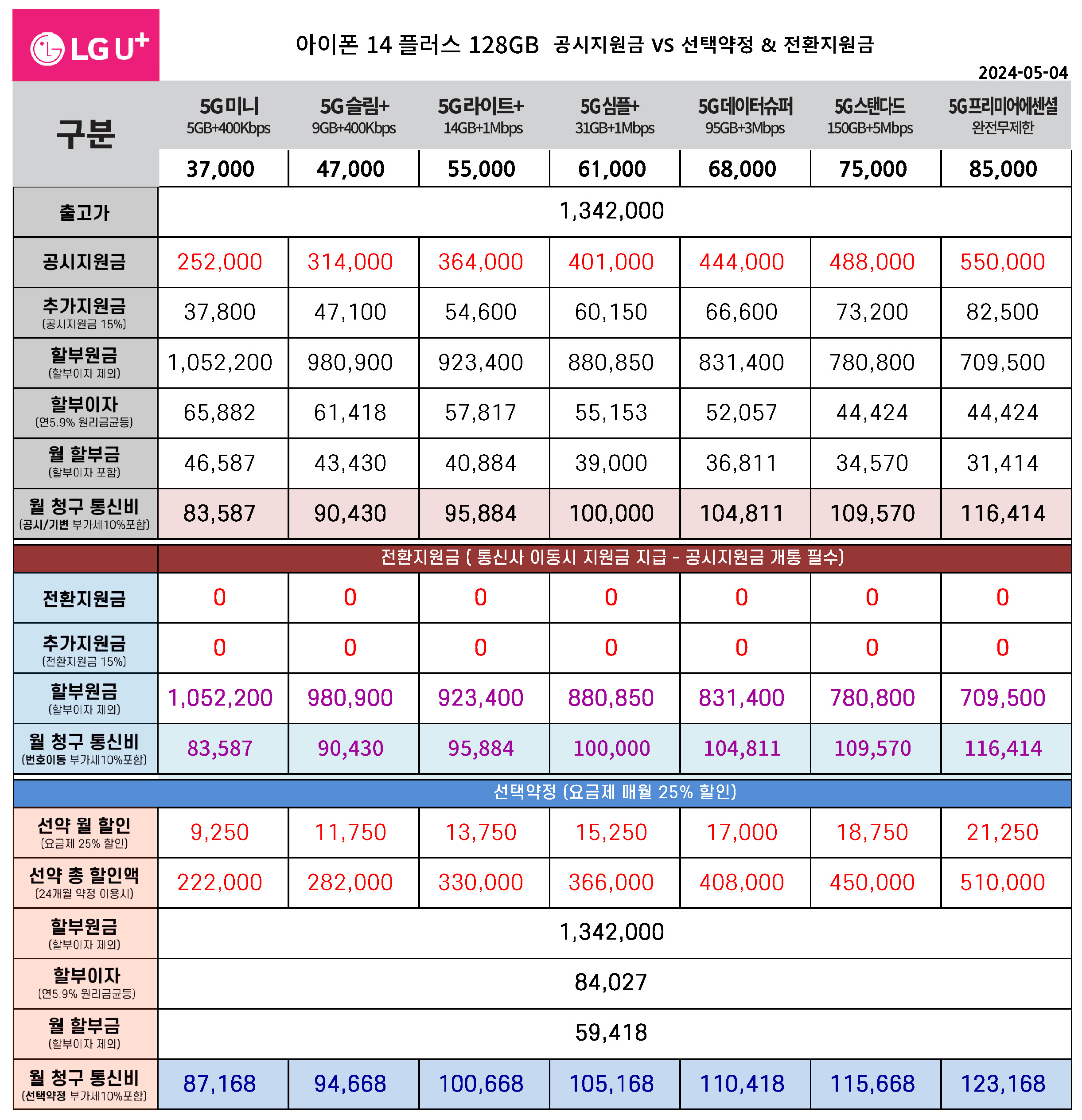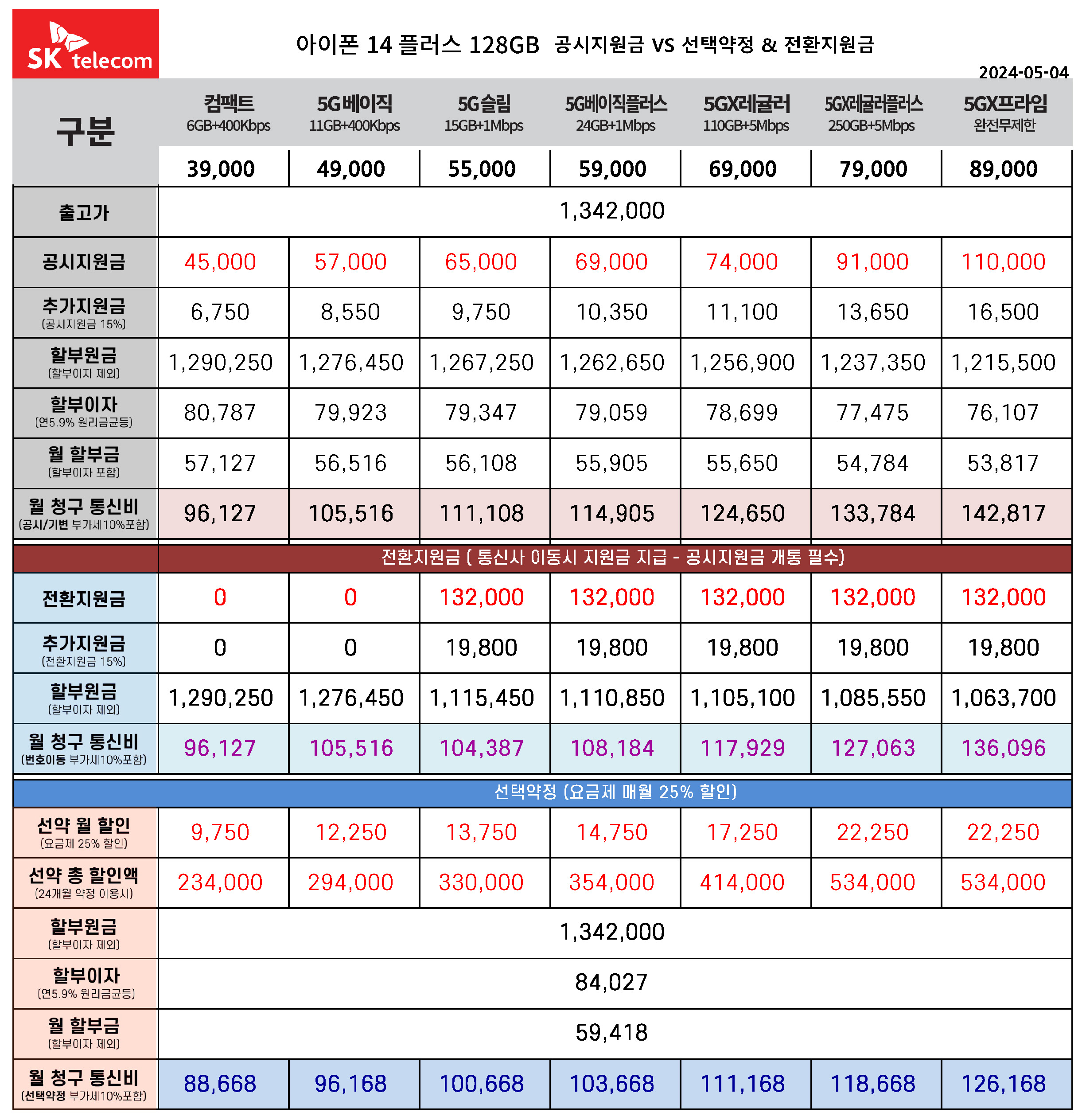 아이폰 14 플러스 128기가 공시지원금, 전환지원금, 선택약정 월 통신요금 비교표