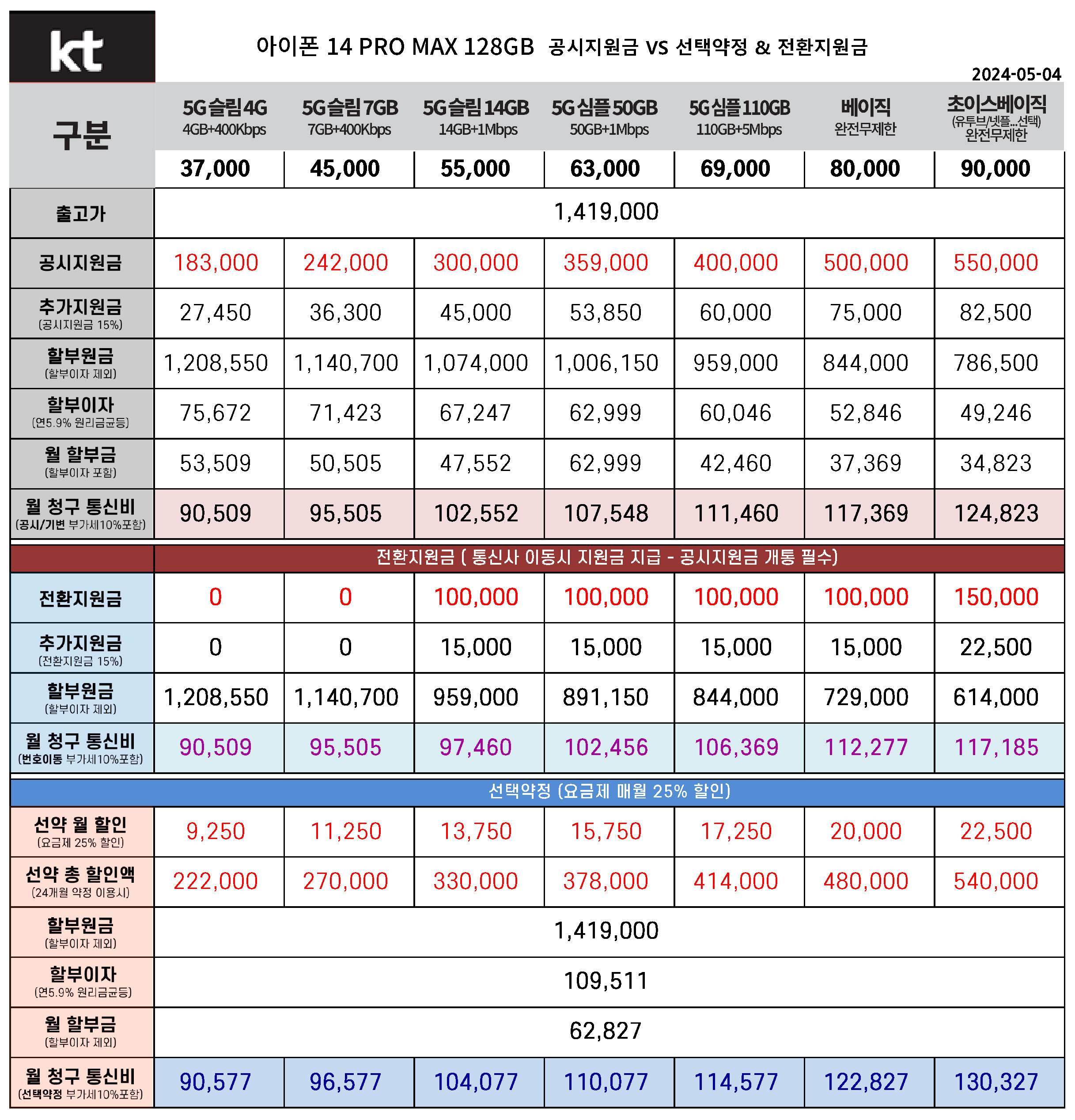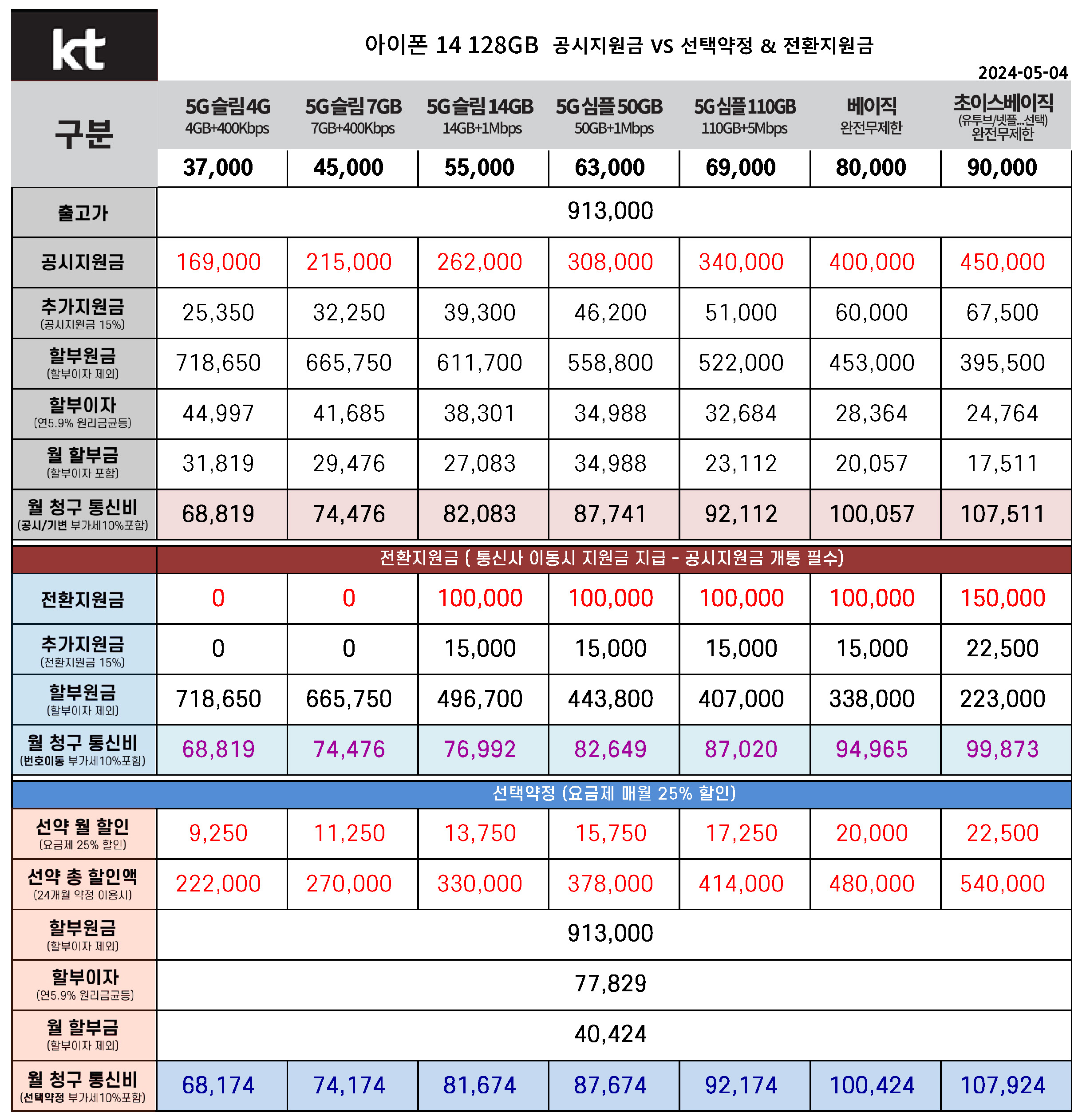 KT 아이폰 14 시리즈 출고가 인하 공시지원금,전환지원금,선택약정 3종 통신비 요금표 - 5월 4일 기준