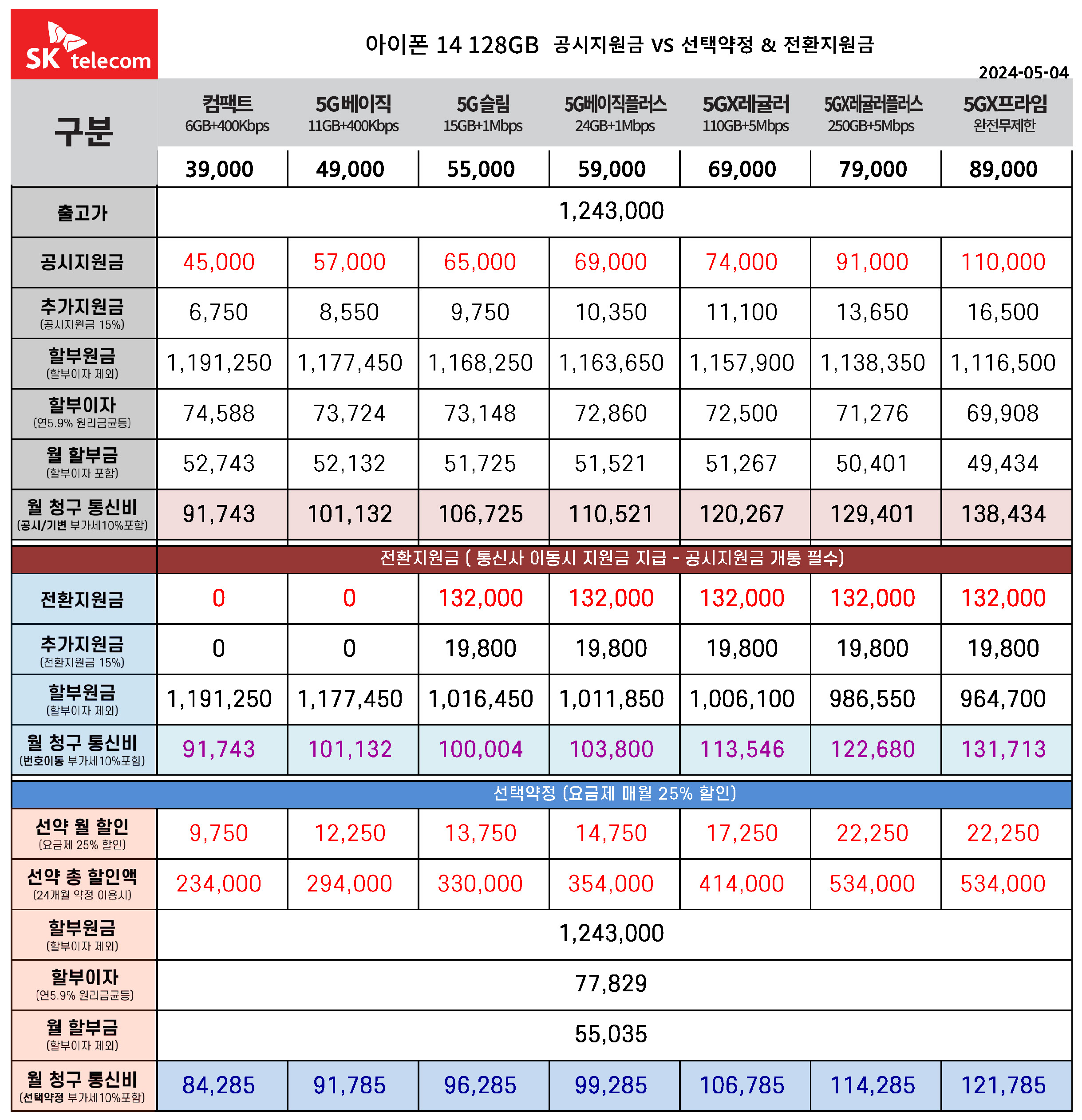 아이폰 14 128기가 공시지원금, 전환지원금, 선택약정 월 통신요금 비교표