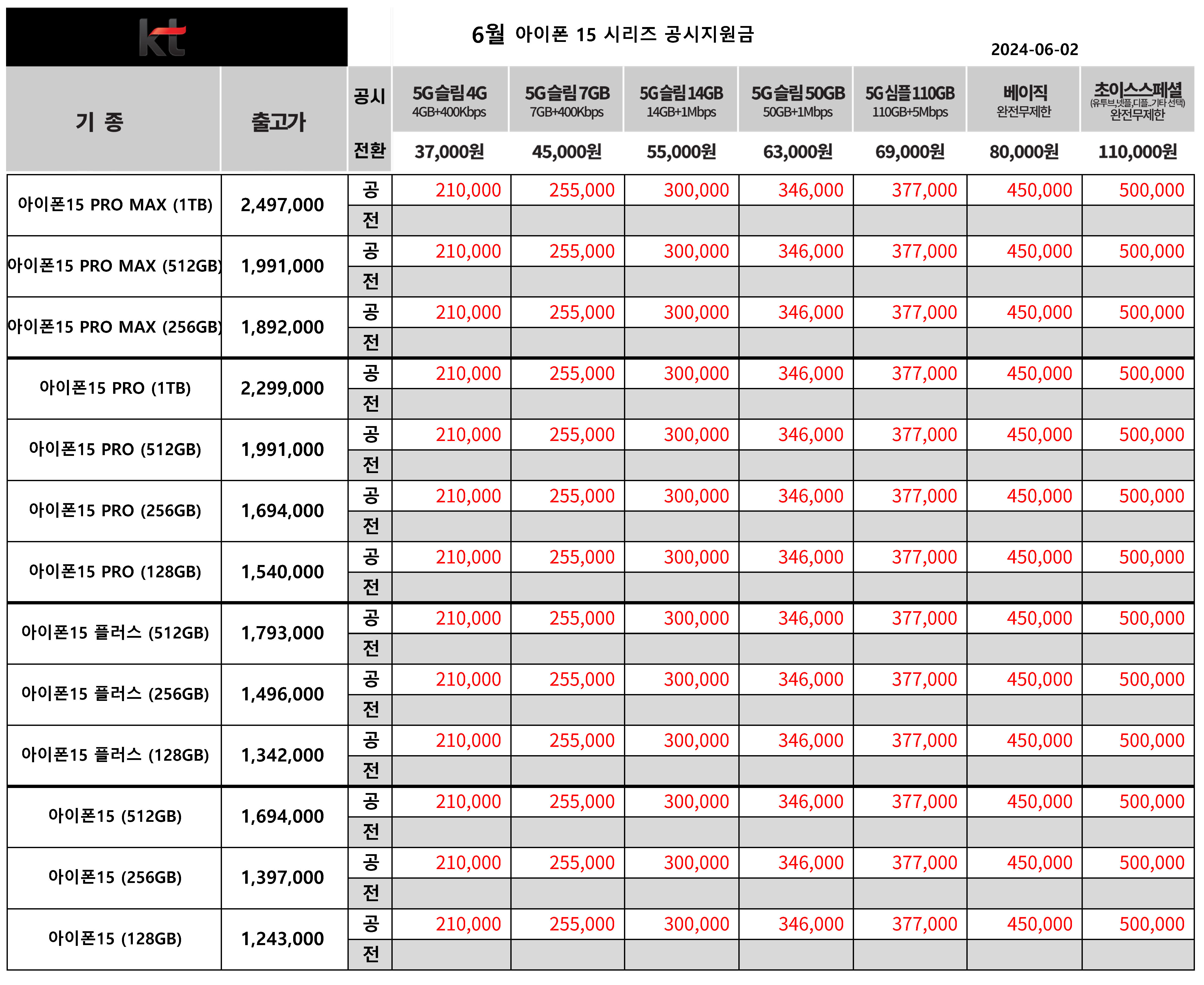 6월 KT 아이폰 15 시리즈 공시지원금 & 전환지원금