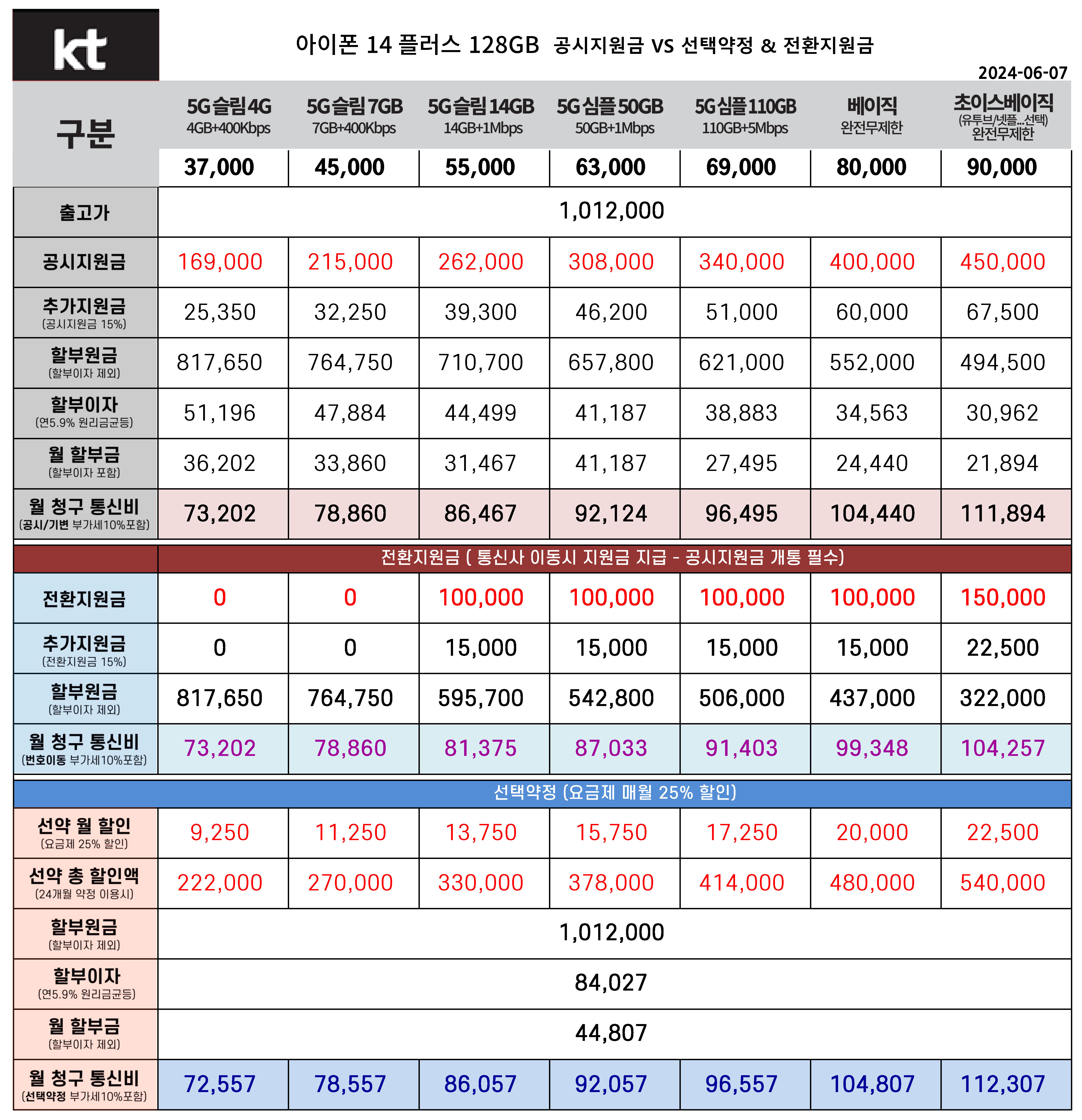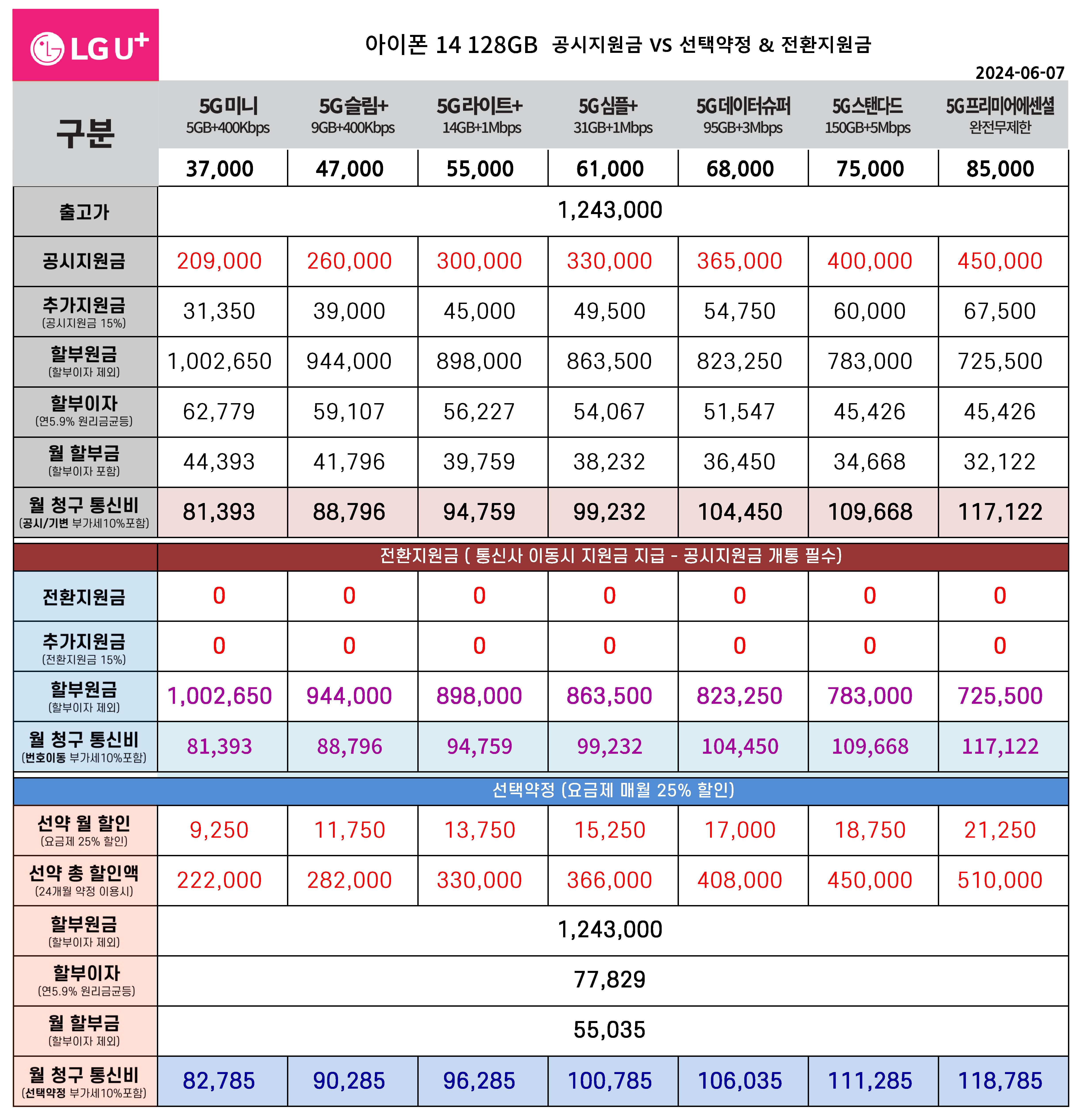 6월 아이폰 14 플러스 128기가 공시지원금, 전환지원금, 선태약정 통신비 요금표(주요 요금제)