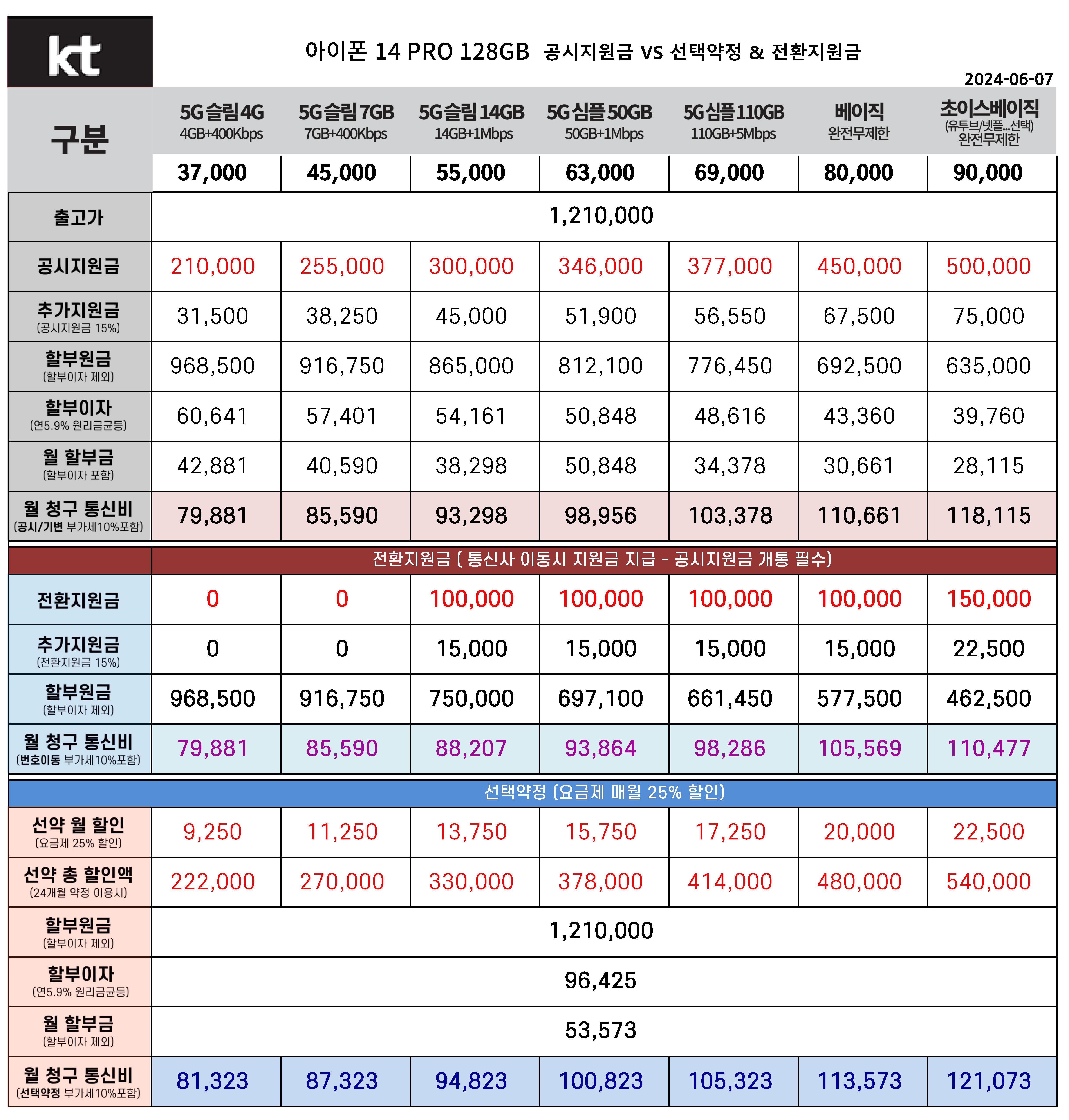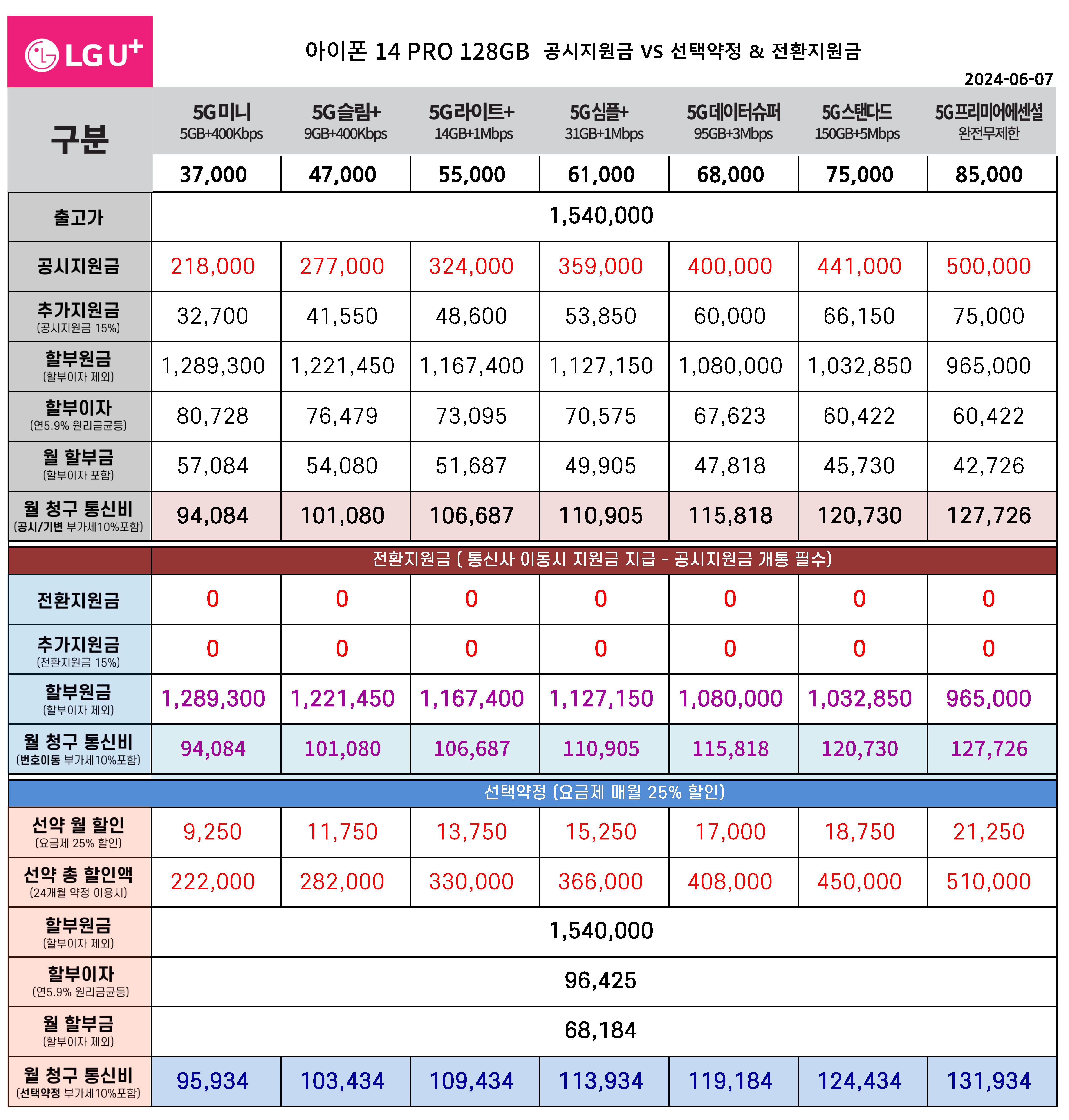 6월 아이폰 14 PRO 128기가 공시지원금, 전환지원금, 선태약정 통신비 요금표(주요 요금제)