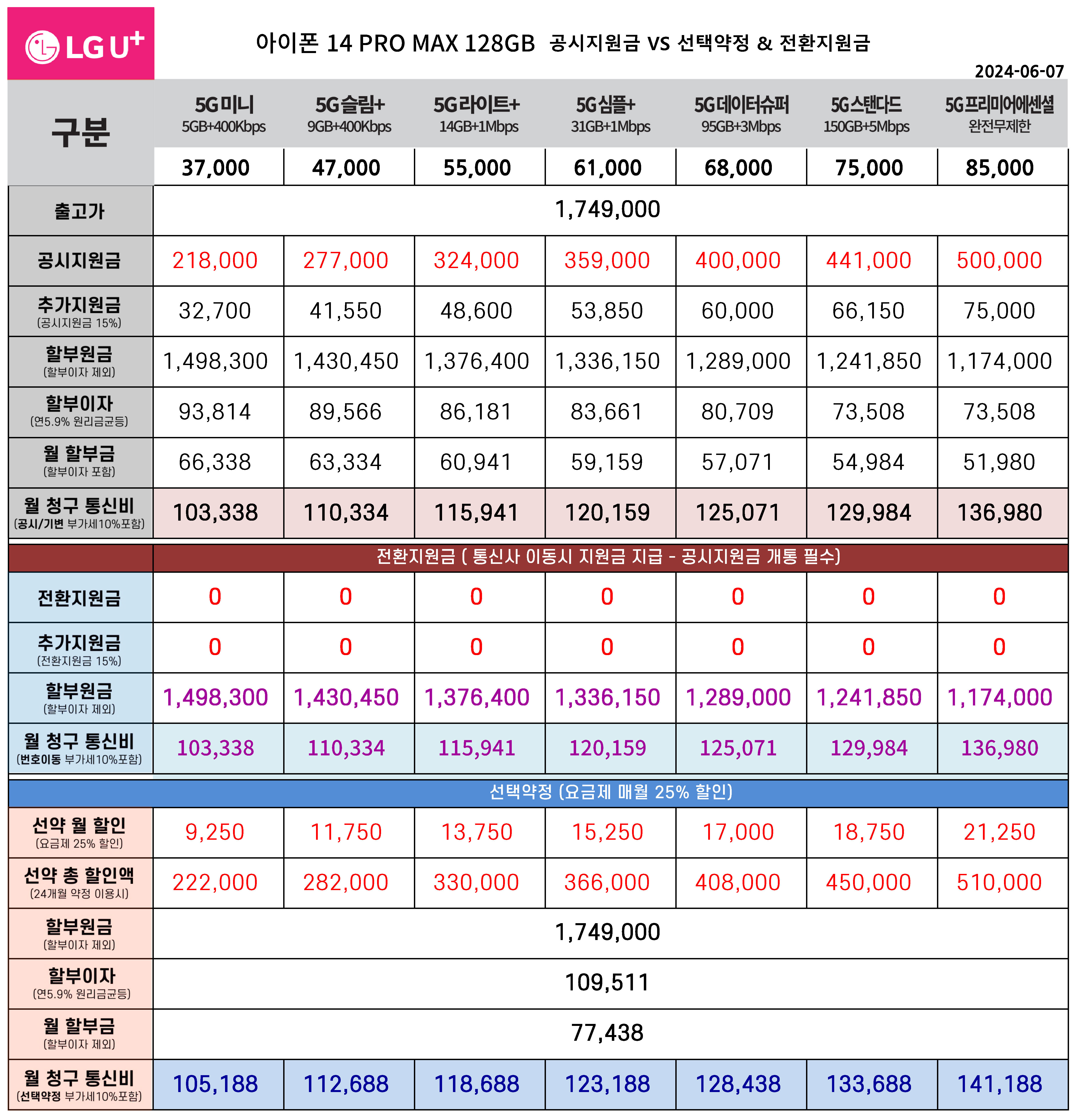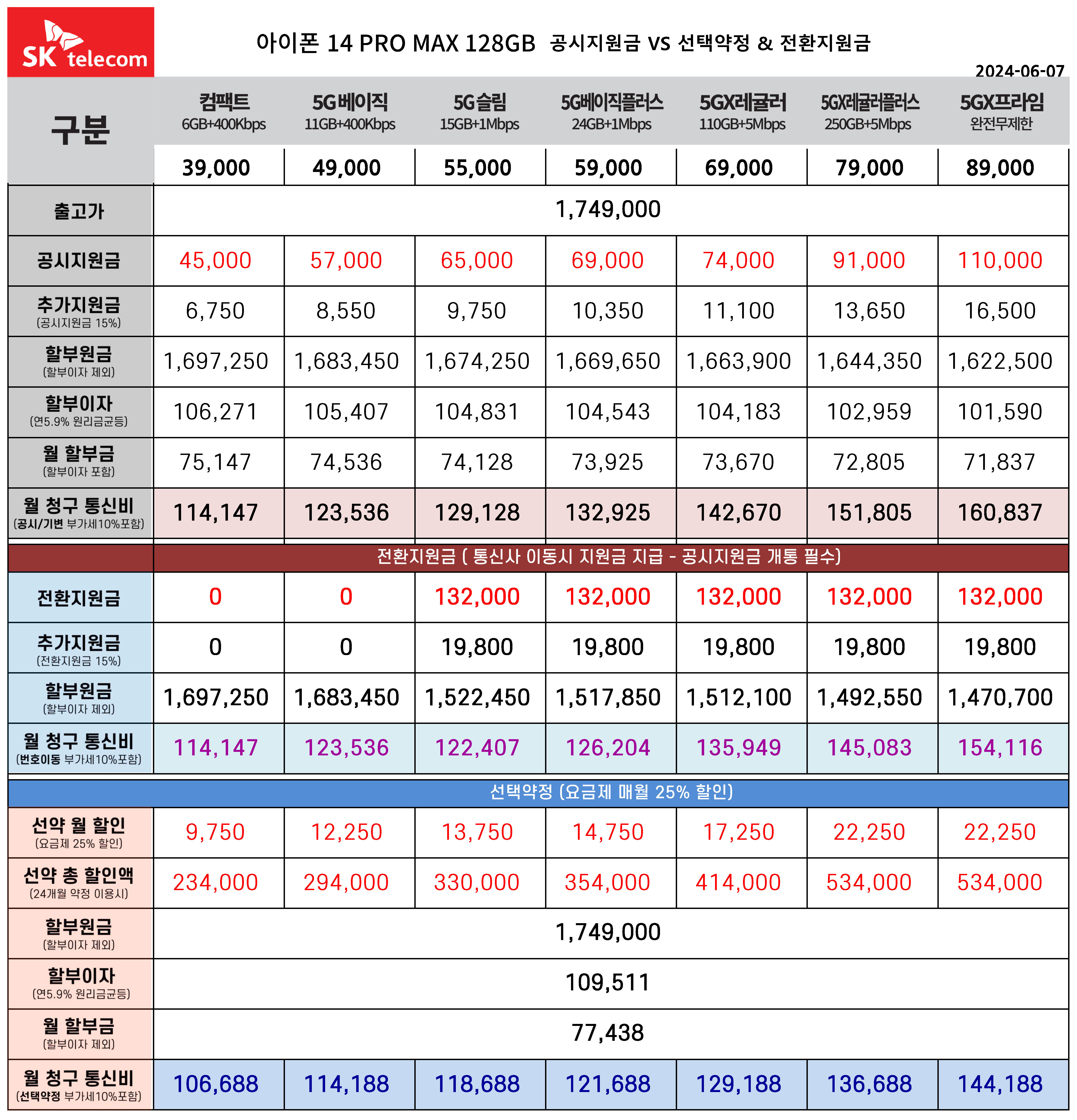 6월 아이폰 14 PRO MAX 128기가 공시지원금, 전환지원금, 선태약정 통신비 요금표(주요 요금제)