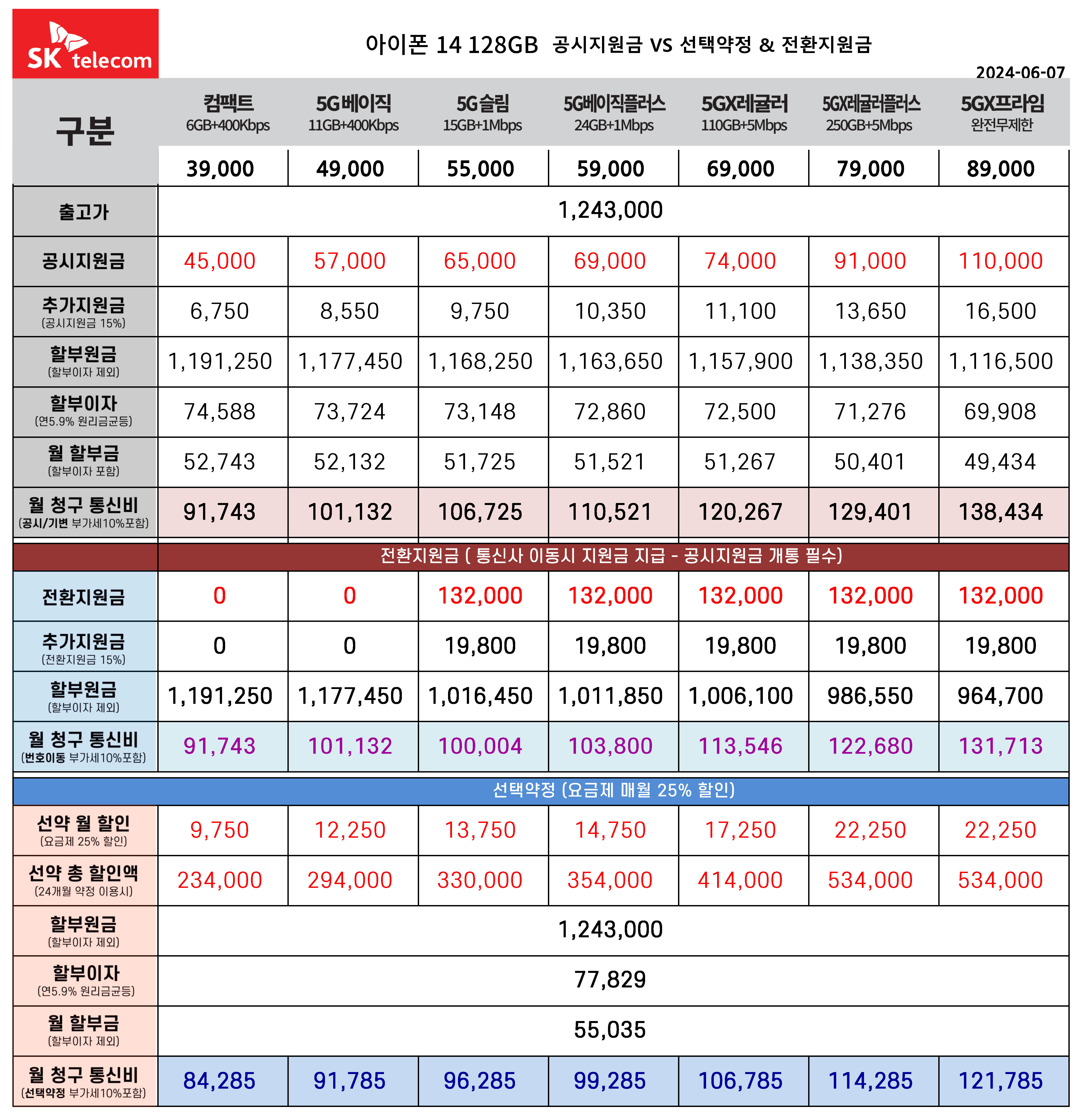 6월 아이폰 14 128기가 공시지원금, 전환지원금, 선태약정 통신비 요금표(주요 요금제)