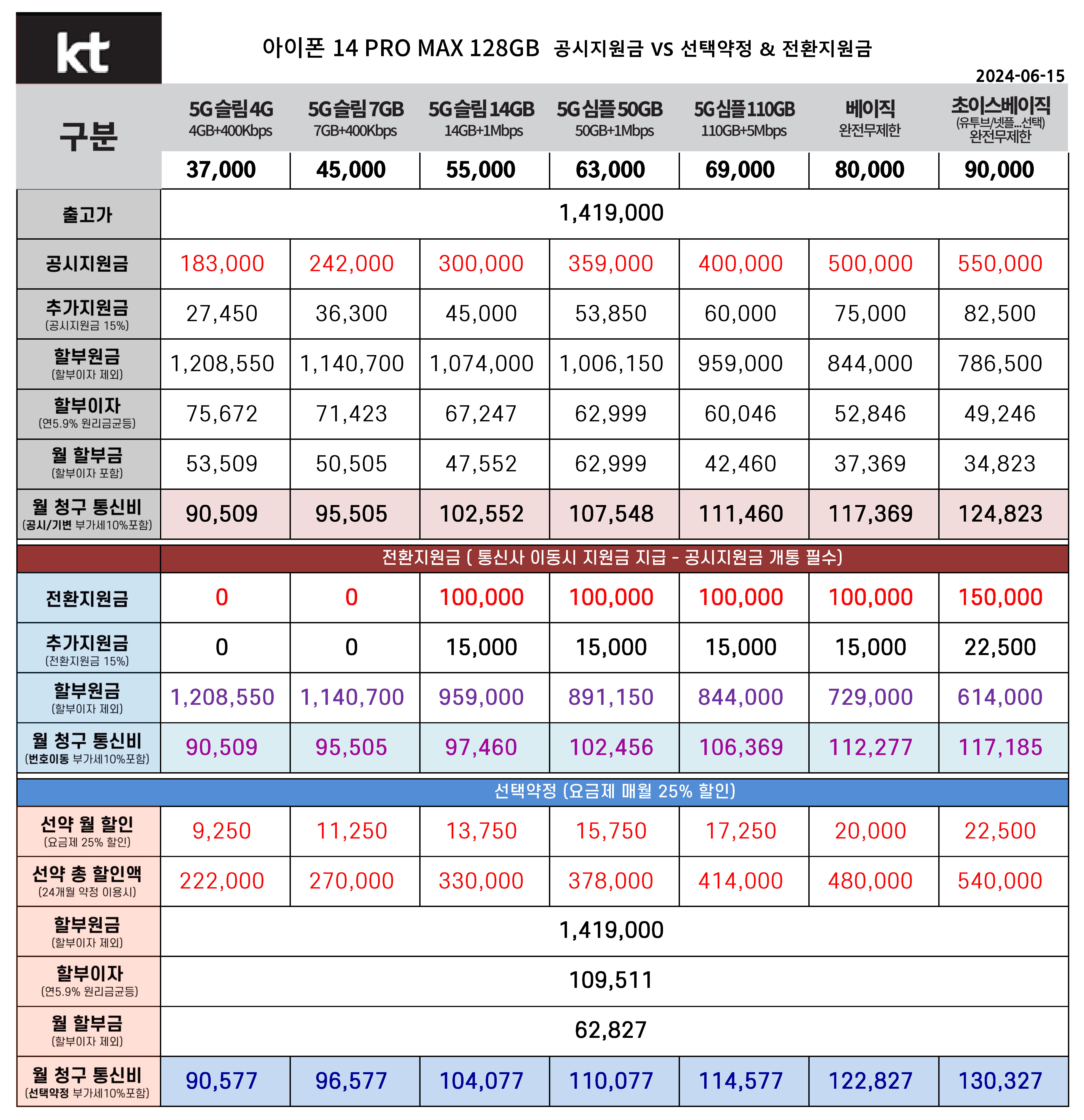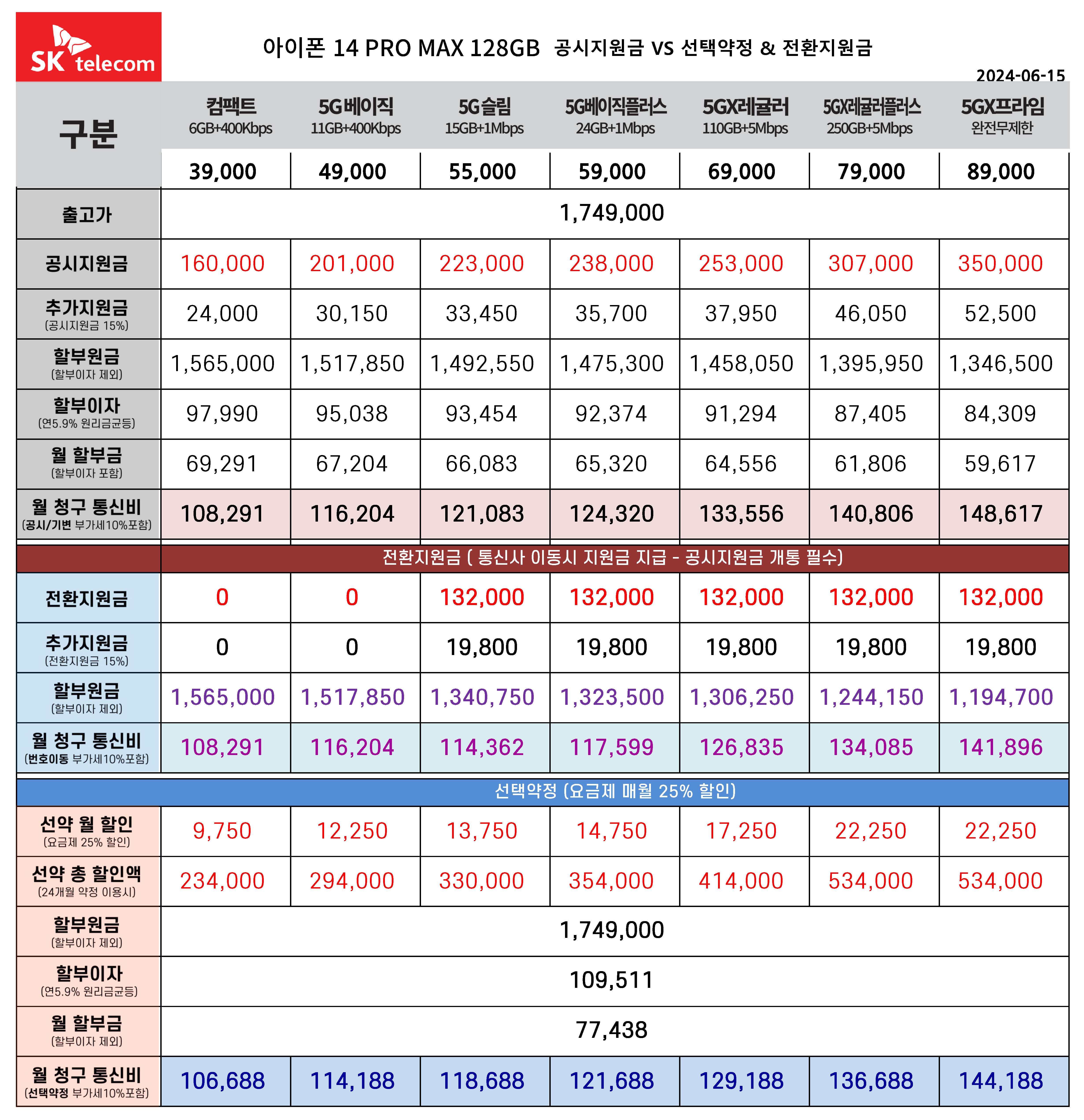 아이폰 14 PRO MAX 128GB 공시지원금 & 전환지원금 & 선택약정 월 통신요금 비교표 - 6월 15일 기준