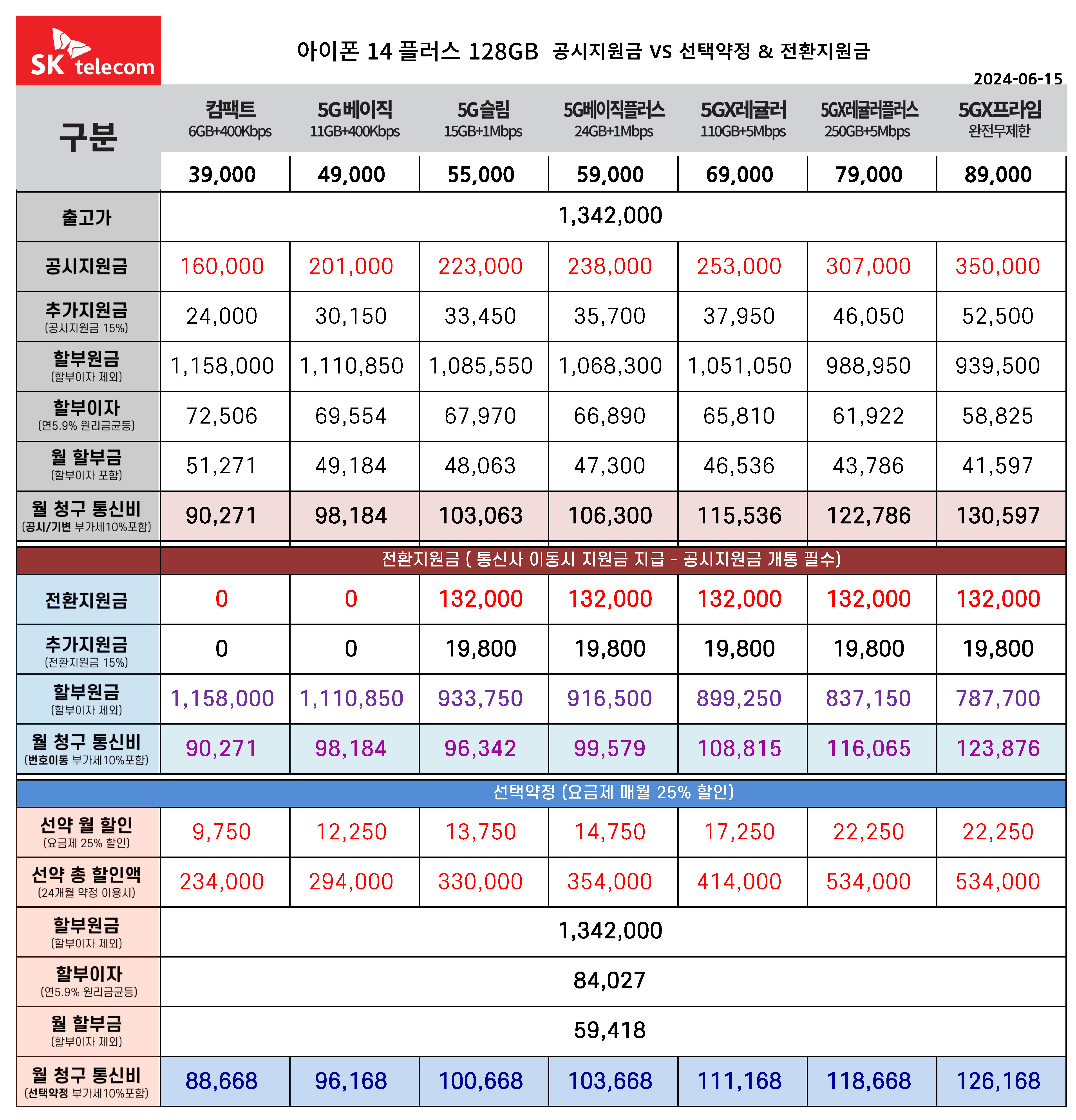 아이폰 14 플러스 128GB 공시지원금 & 전환지원금 & 선택약정 월 통신요금 비교표 - 6월 15일 기준