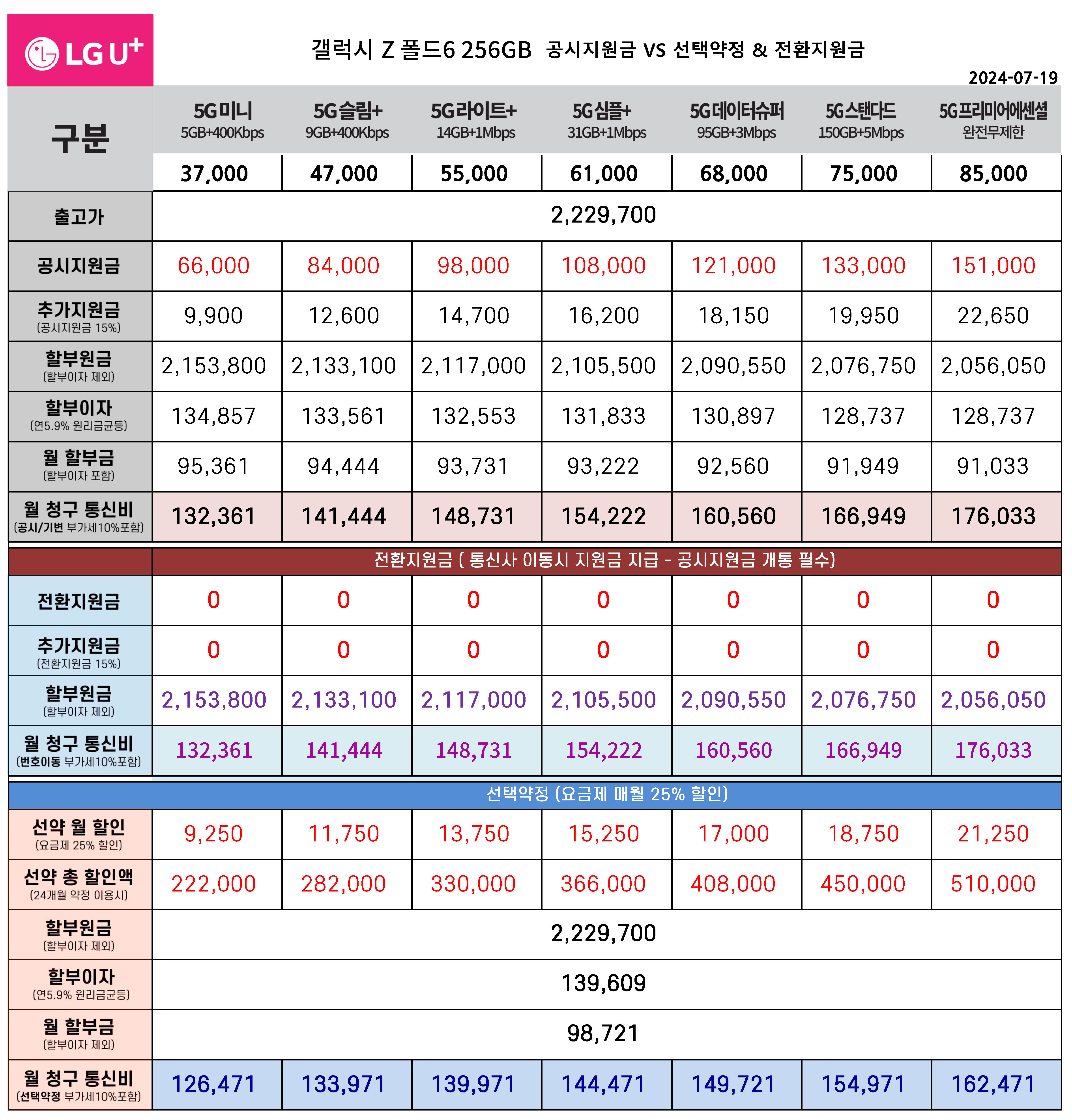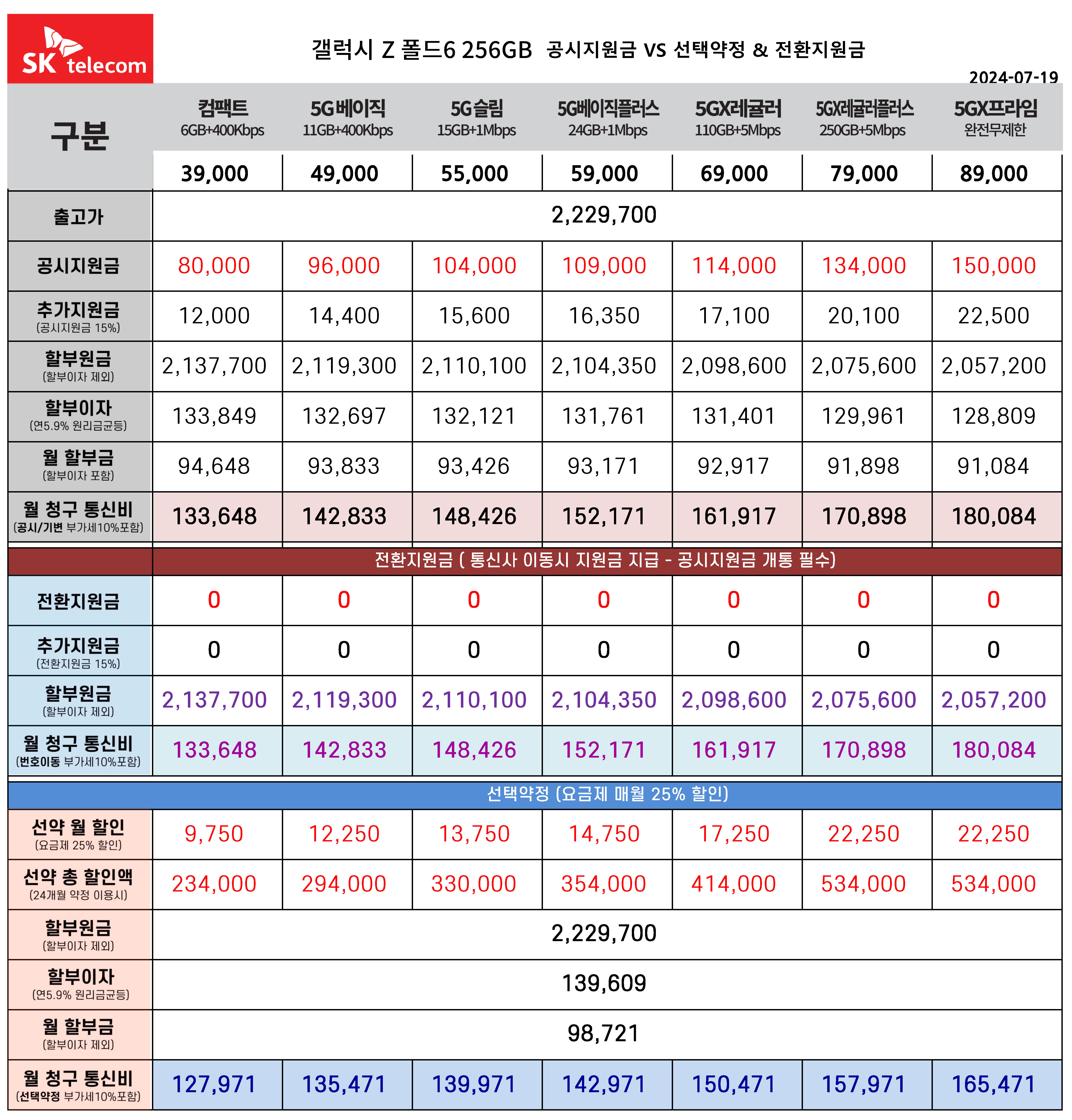 갤럭시 Z 폴드6 공시지원금 & 선택약정 월 통신요금 비교표