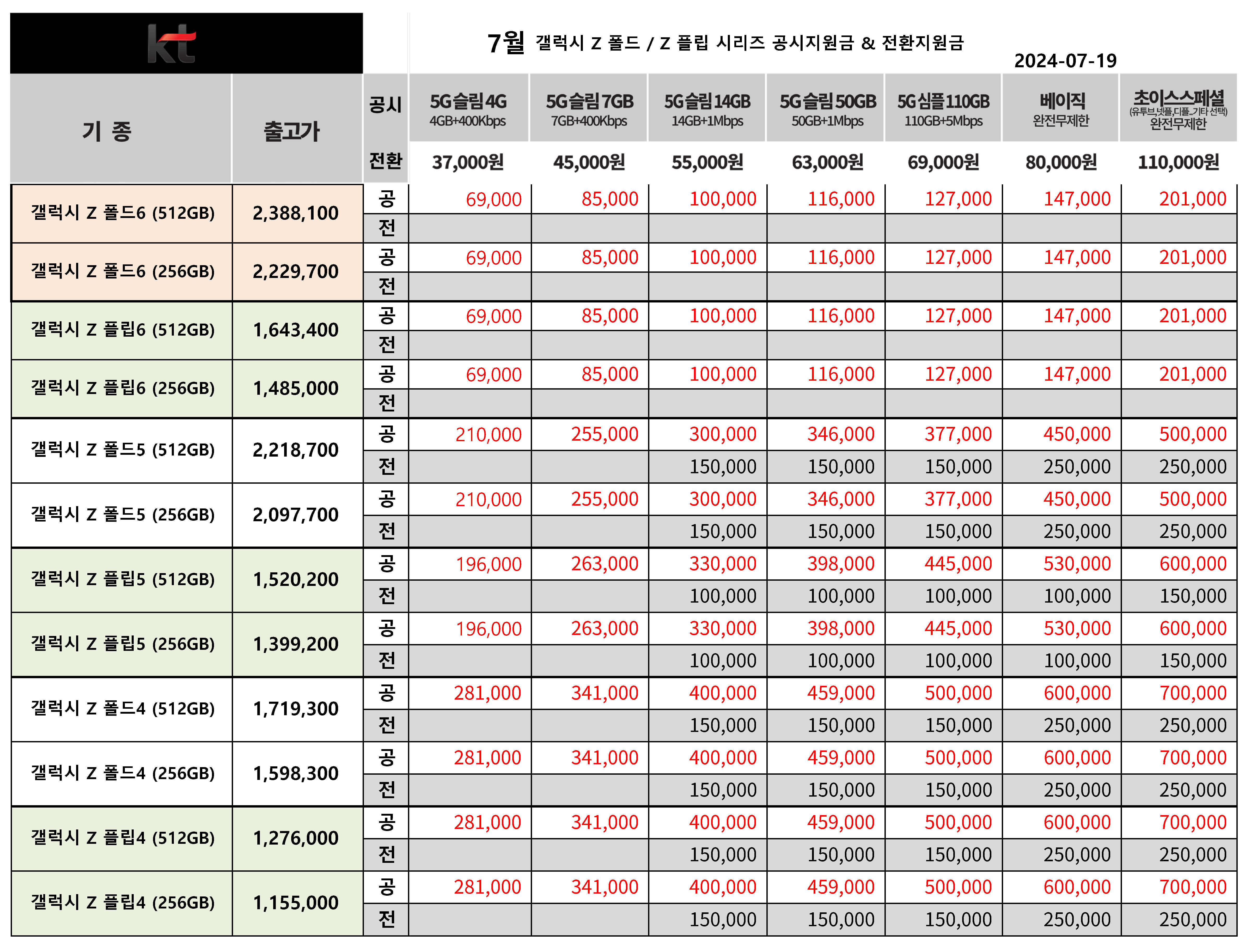 7월 KT 갤럭시 Z 시리즈 공시지원금 & 전환지원금