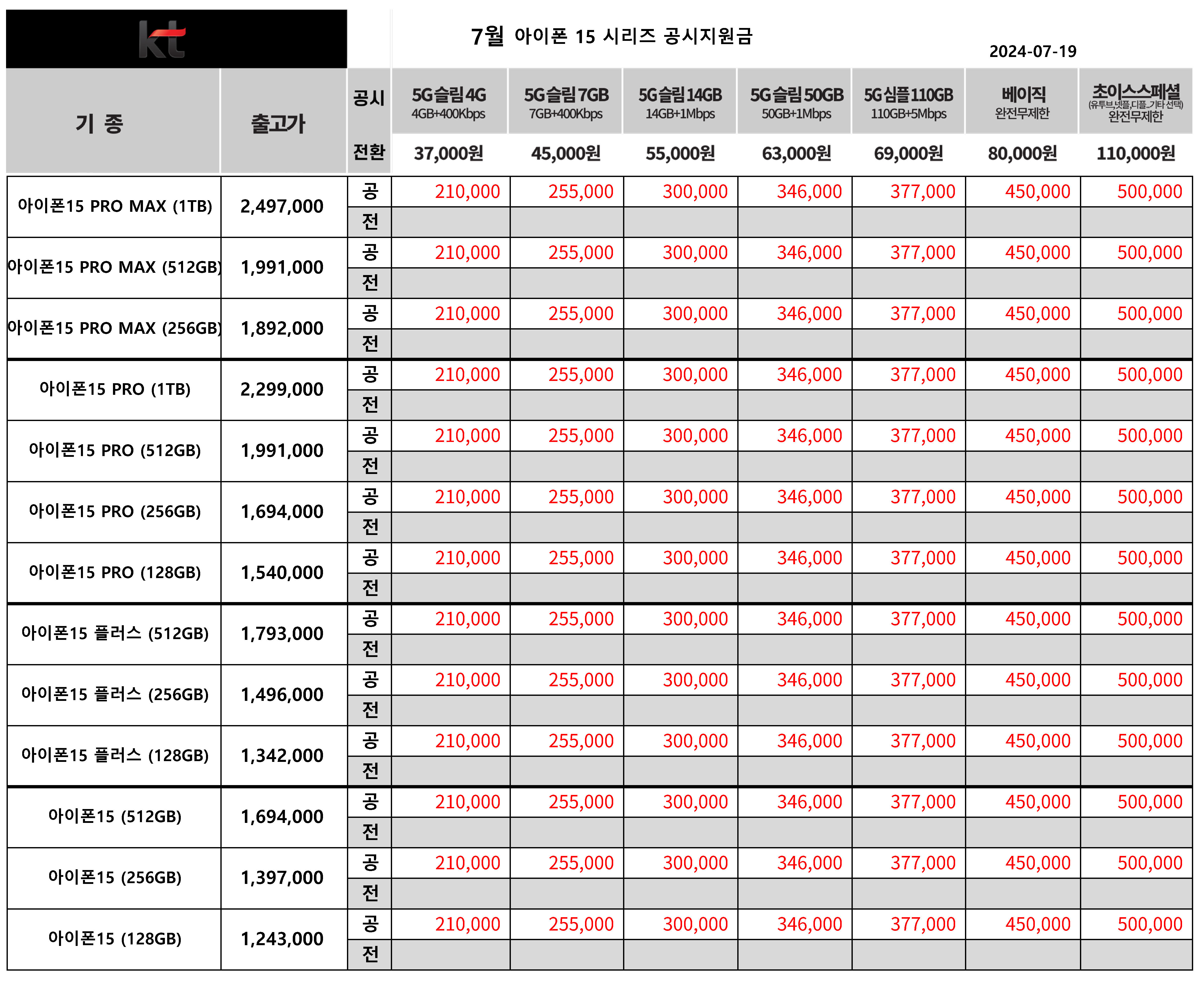 7월 KT 갤럭시 아이폰 15 공시지원금 & 전환지원금 - 전기종 6월과 변동 없음