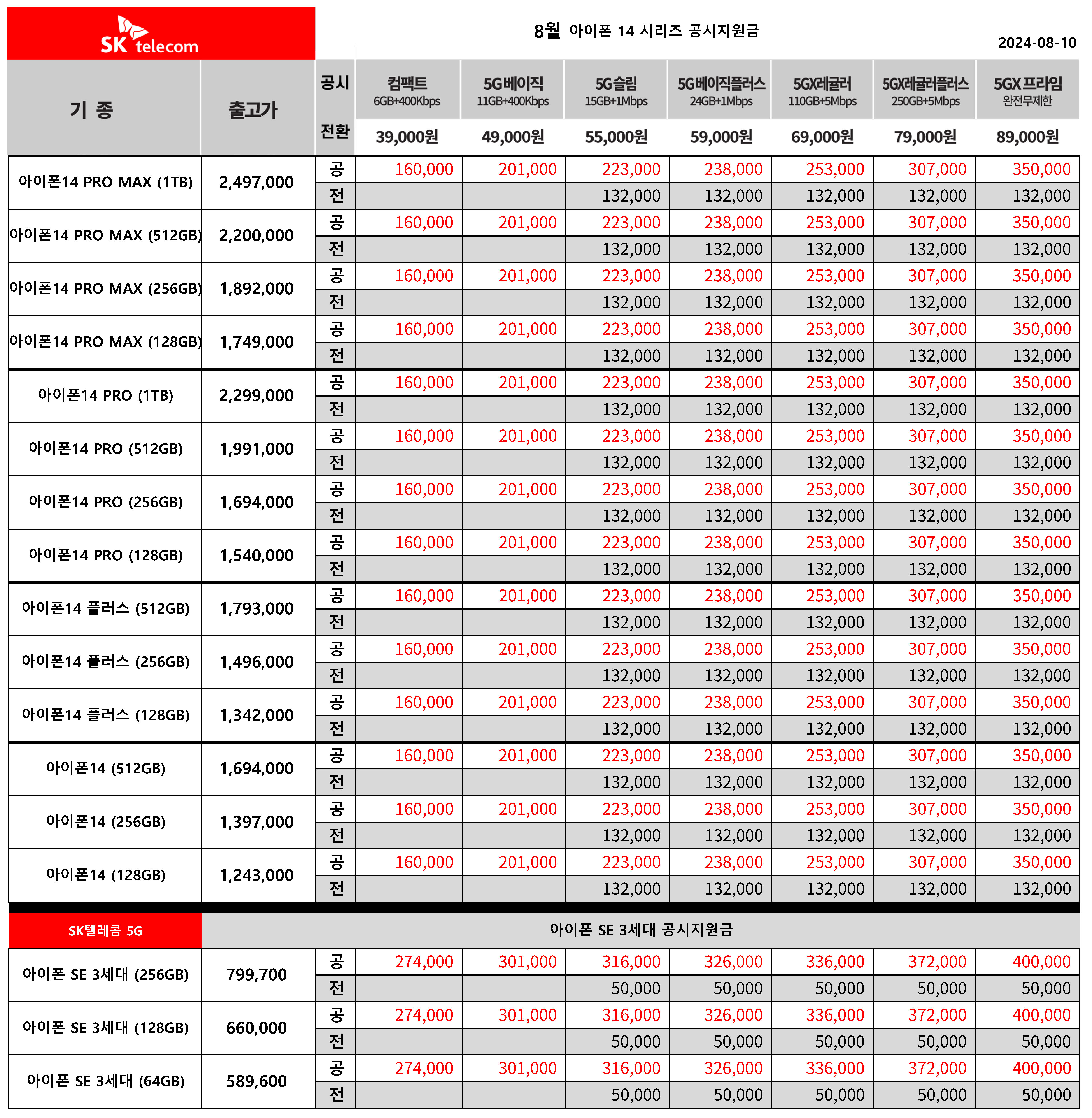 8월 SK텔레콤 주요 핸드폰 공시지원금 정리