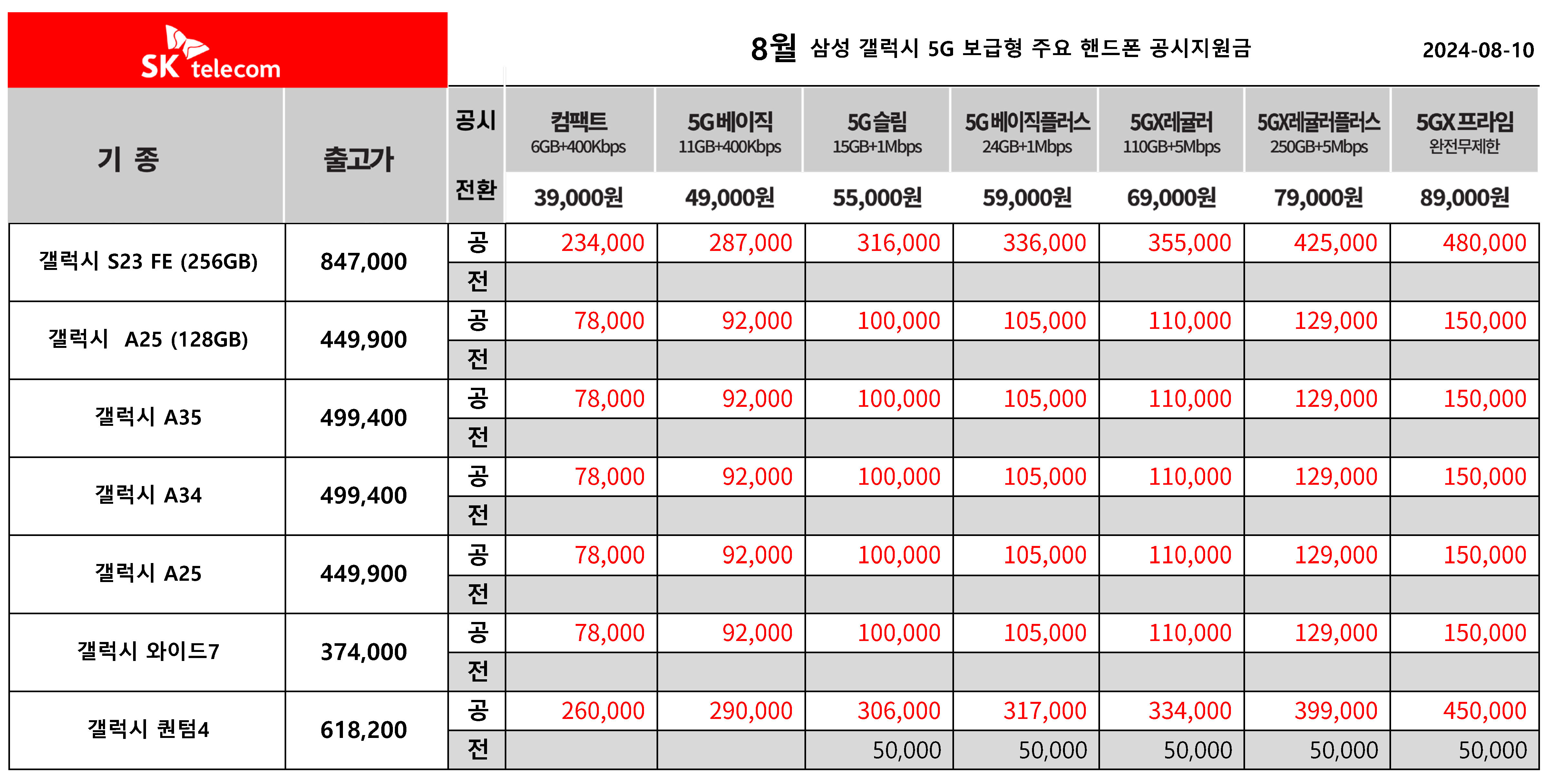 8월 SK텔레콤 갤럭시 보급형 시리즈 공시지원금