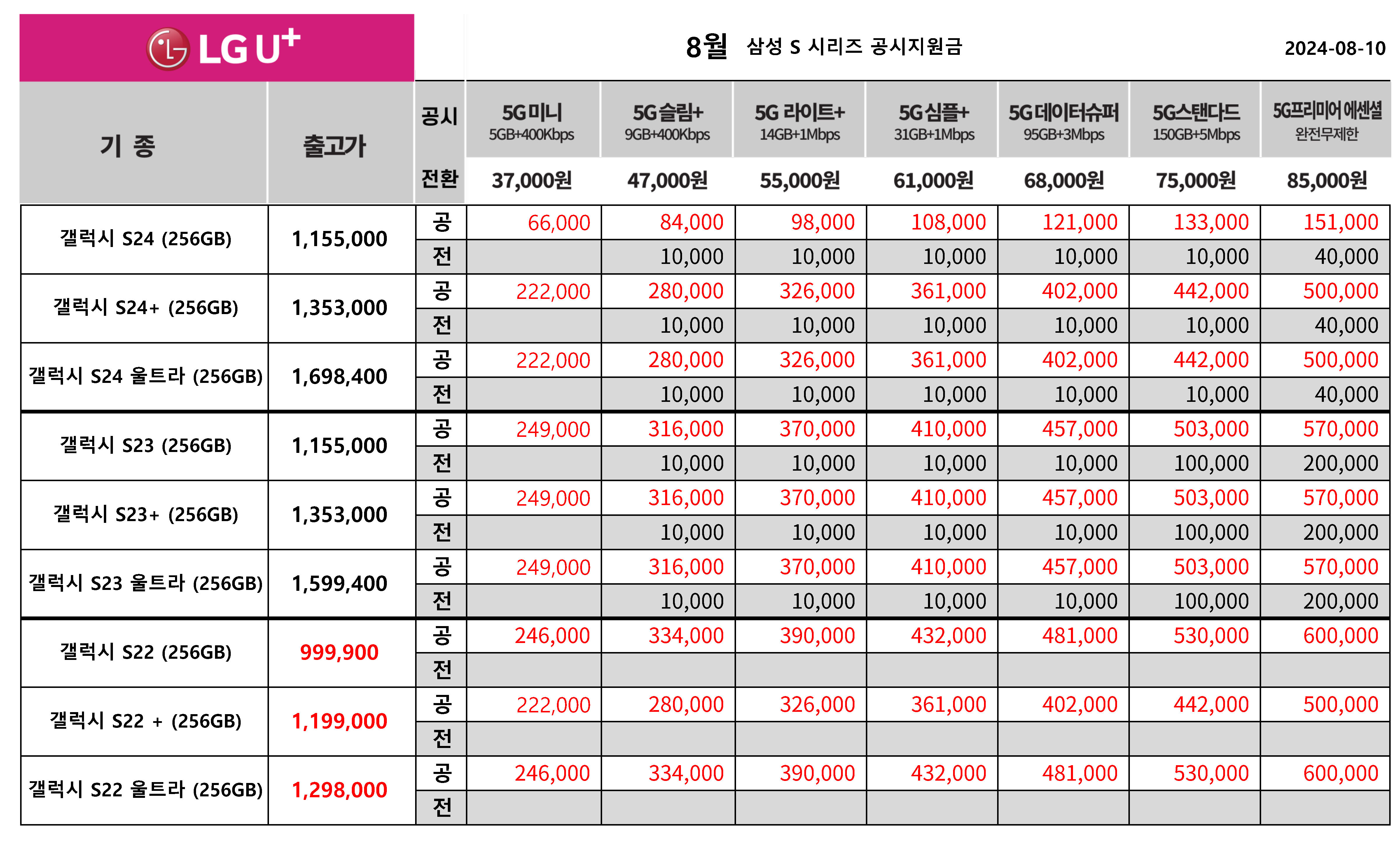8월 LG 유플러스 주요 핸드폰 공시지원금 정리