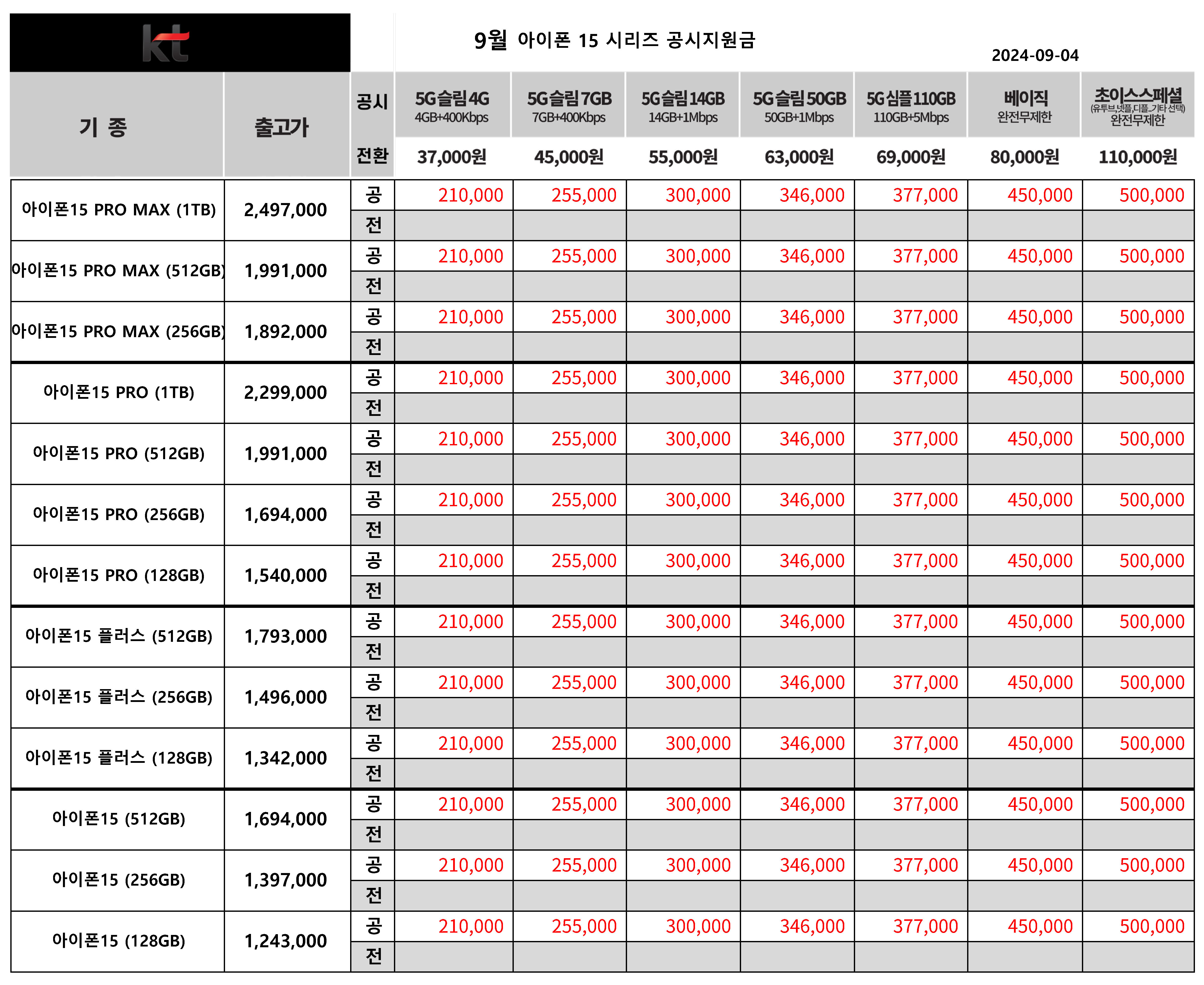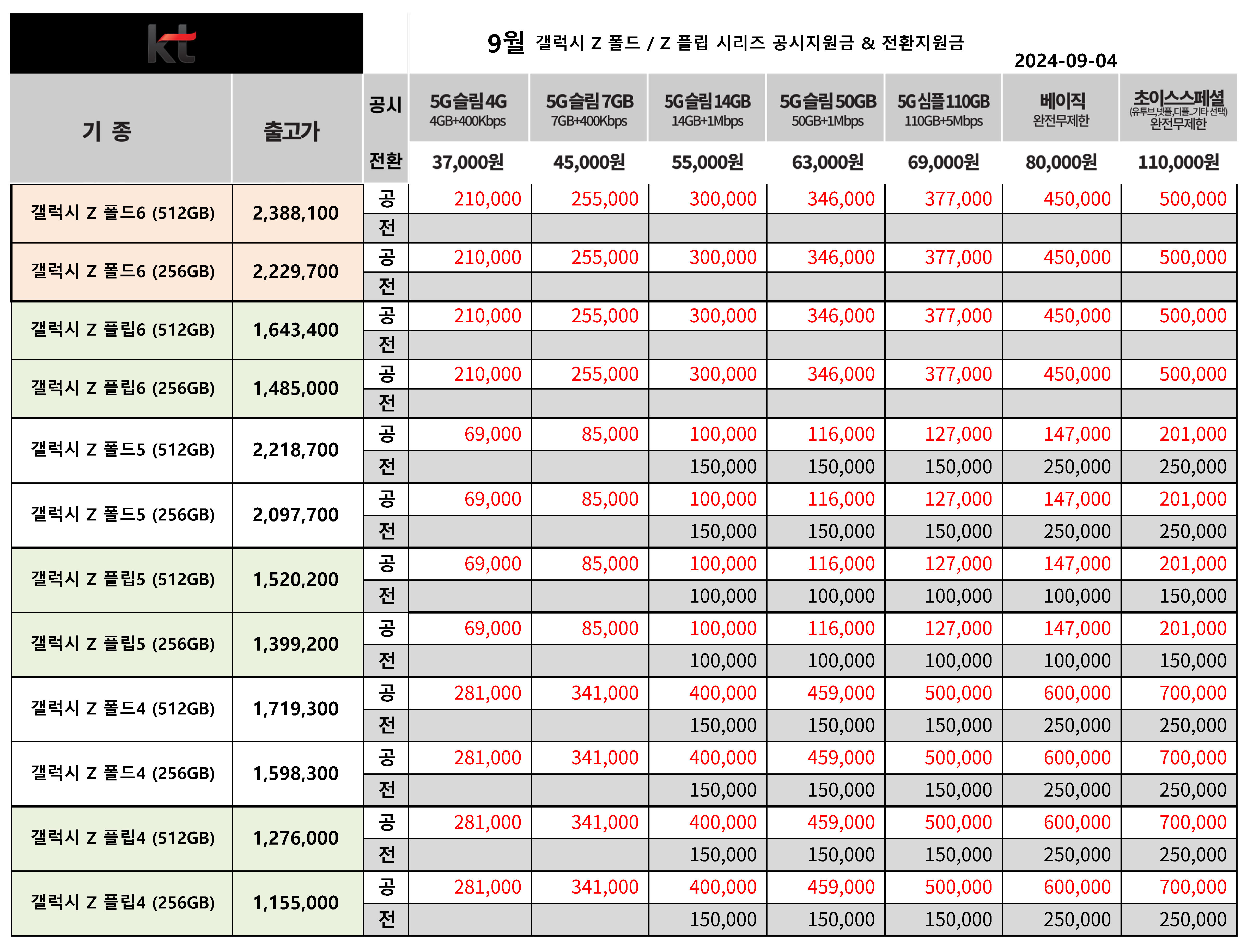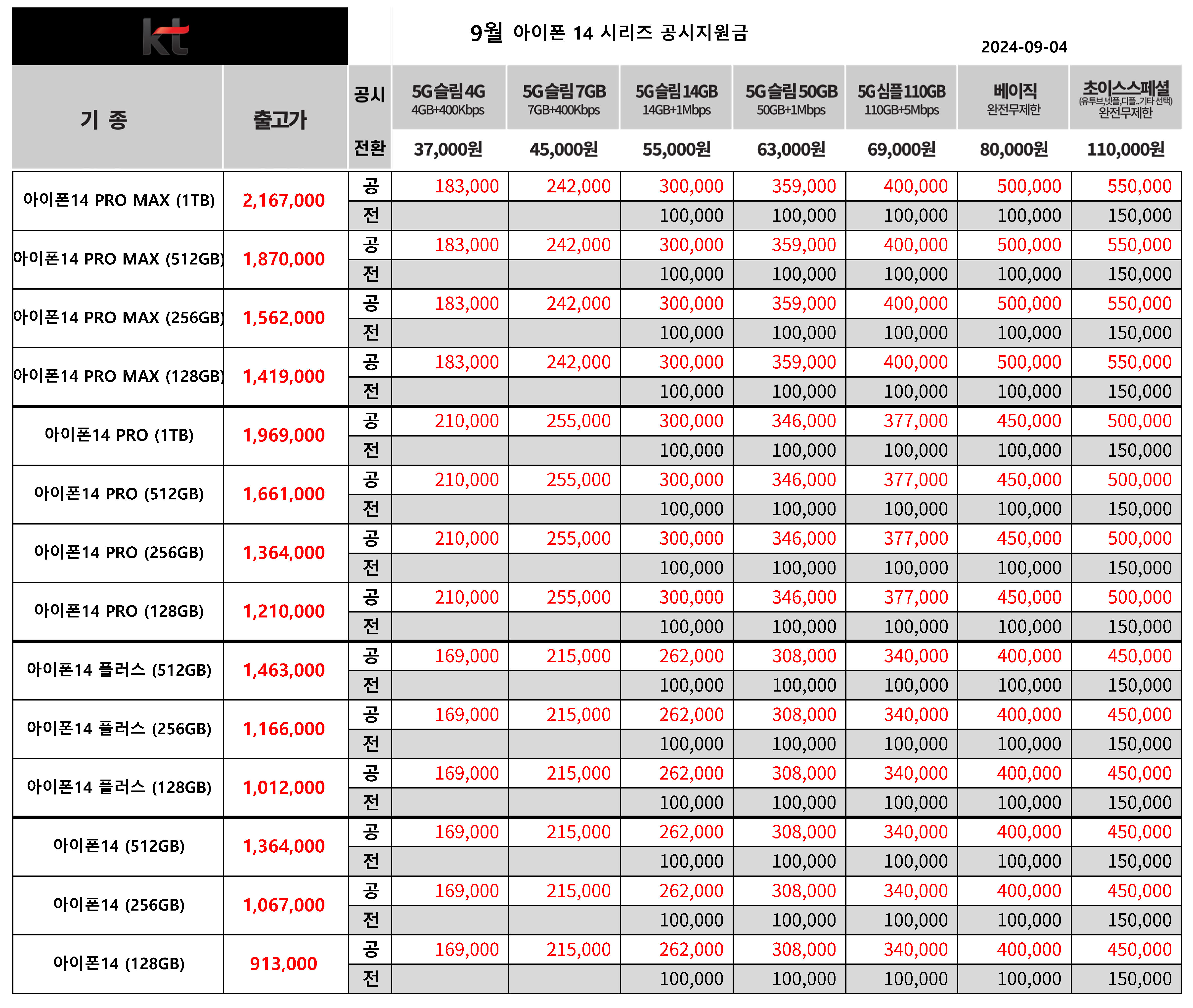 9월 KT 주요 휴대폰 공시지원금 & 전환지원금