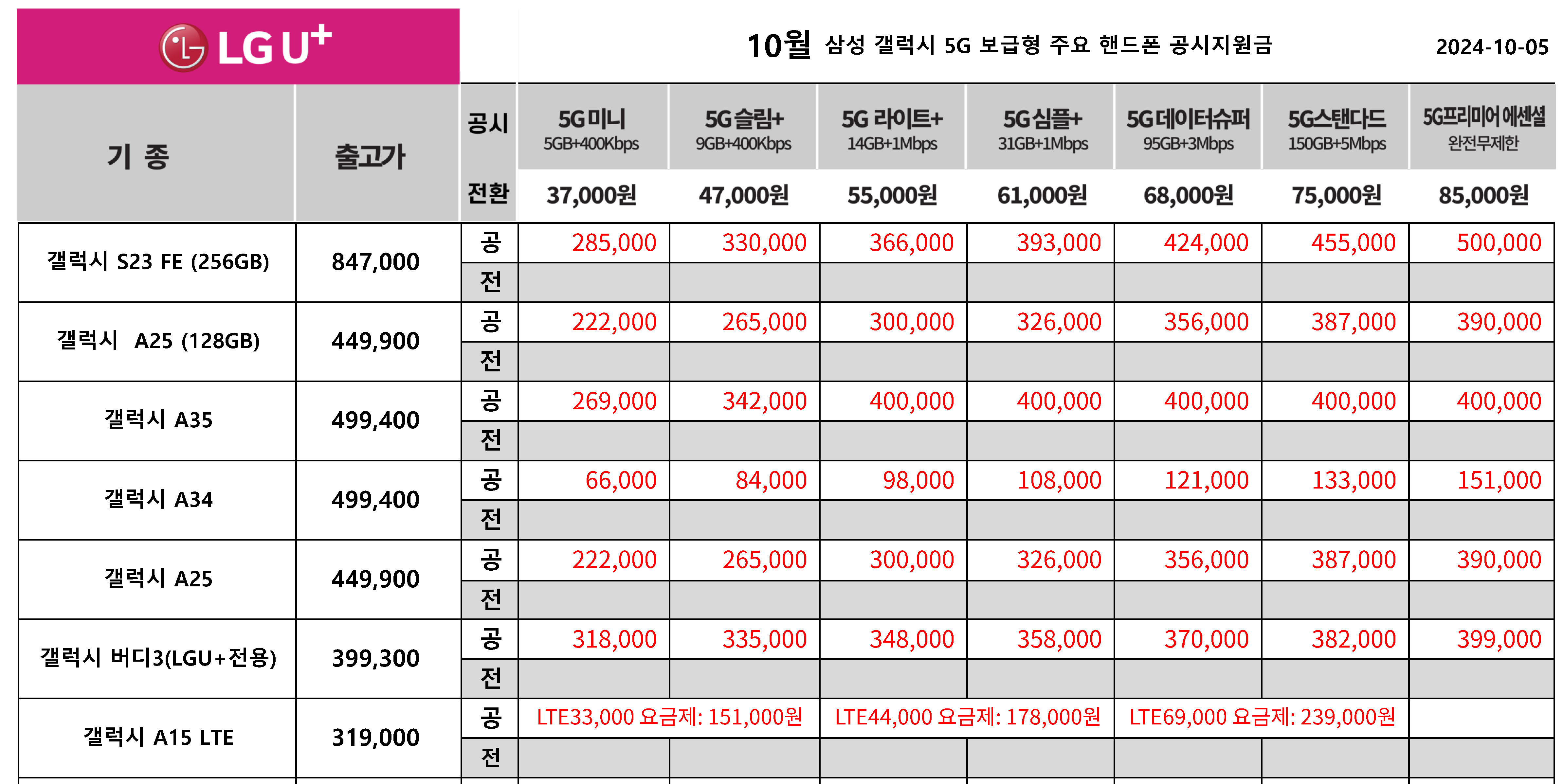 10월 LG 유플러스 갤럭시 보급형 시리즈 출고가 & 공시지원금