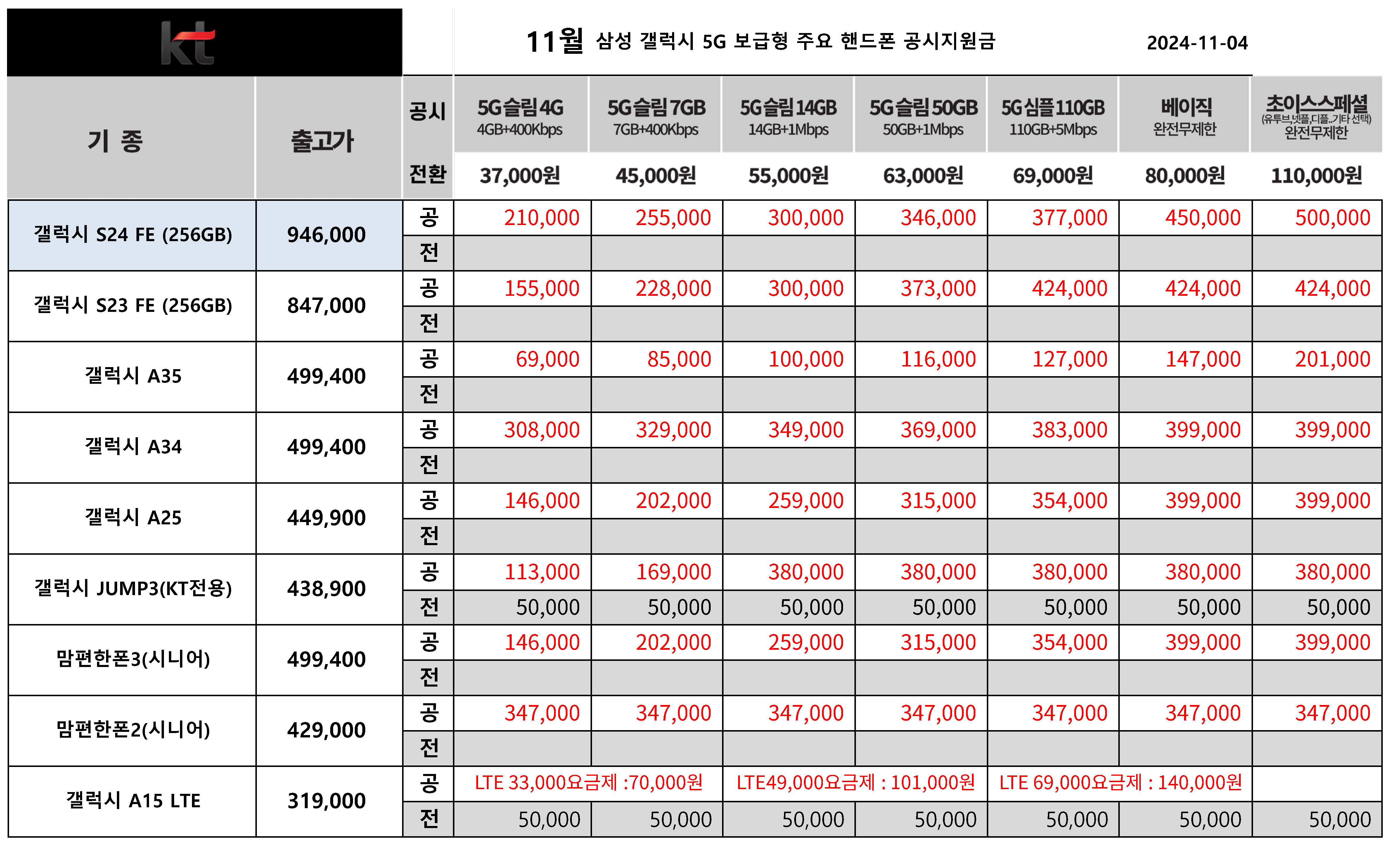 11월 KT 갤럭시 S24, S23, S22 시리즈 출고가 & 공시지원금