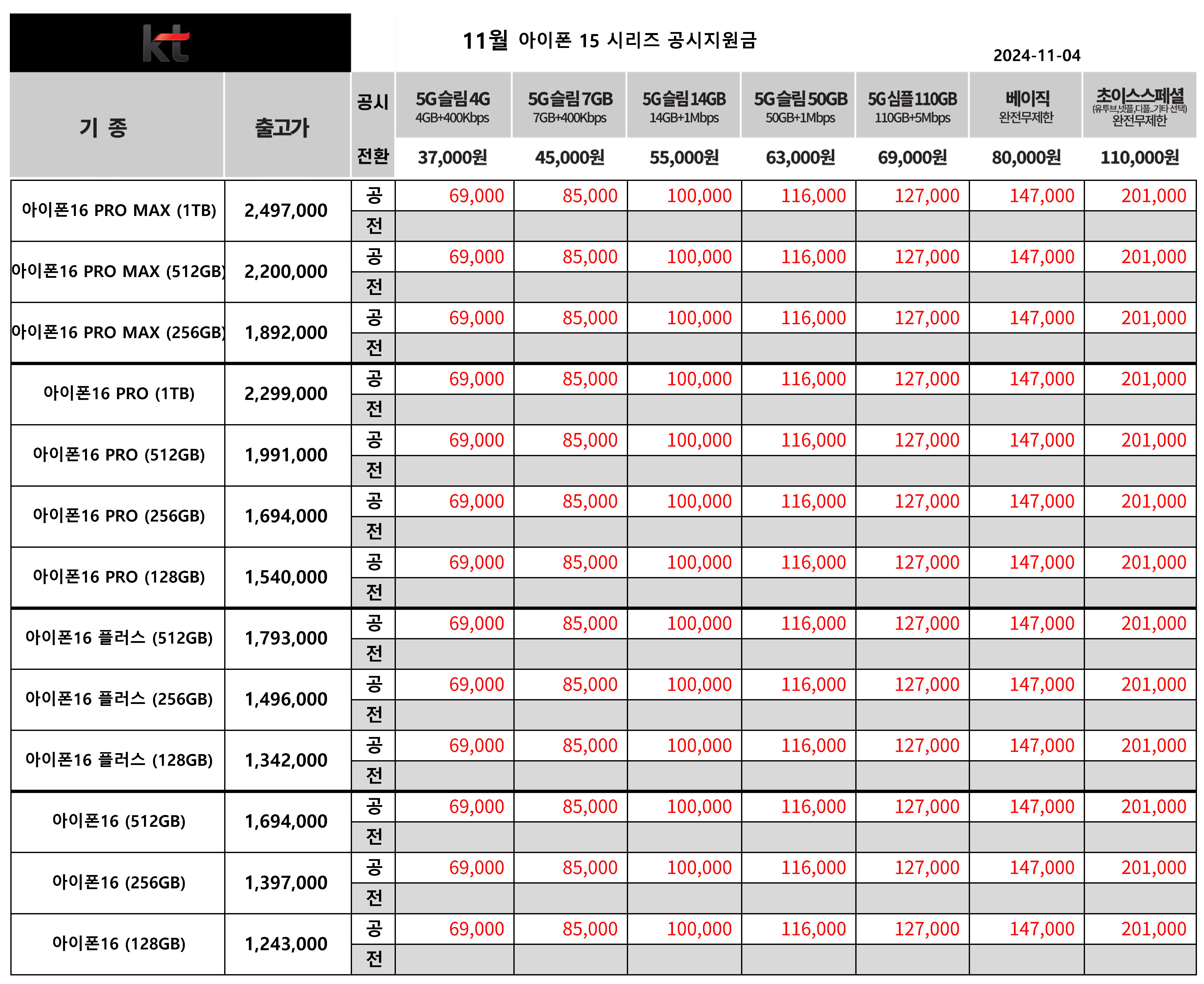 11월 KT 아이폰 16 시리즈 출고가 & 공시지원금