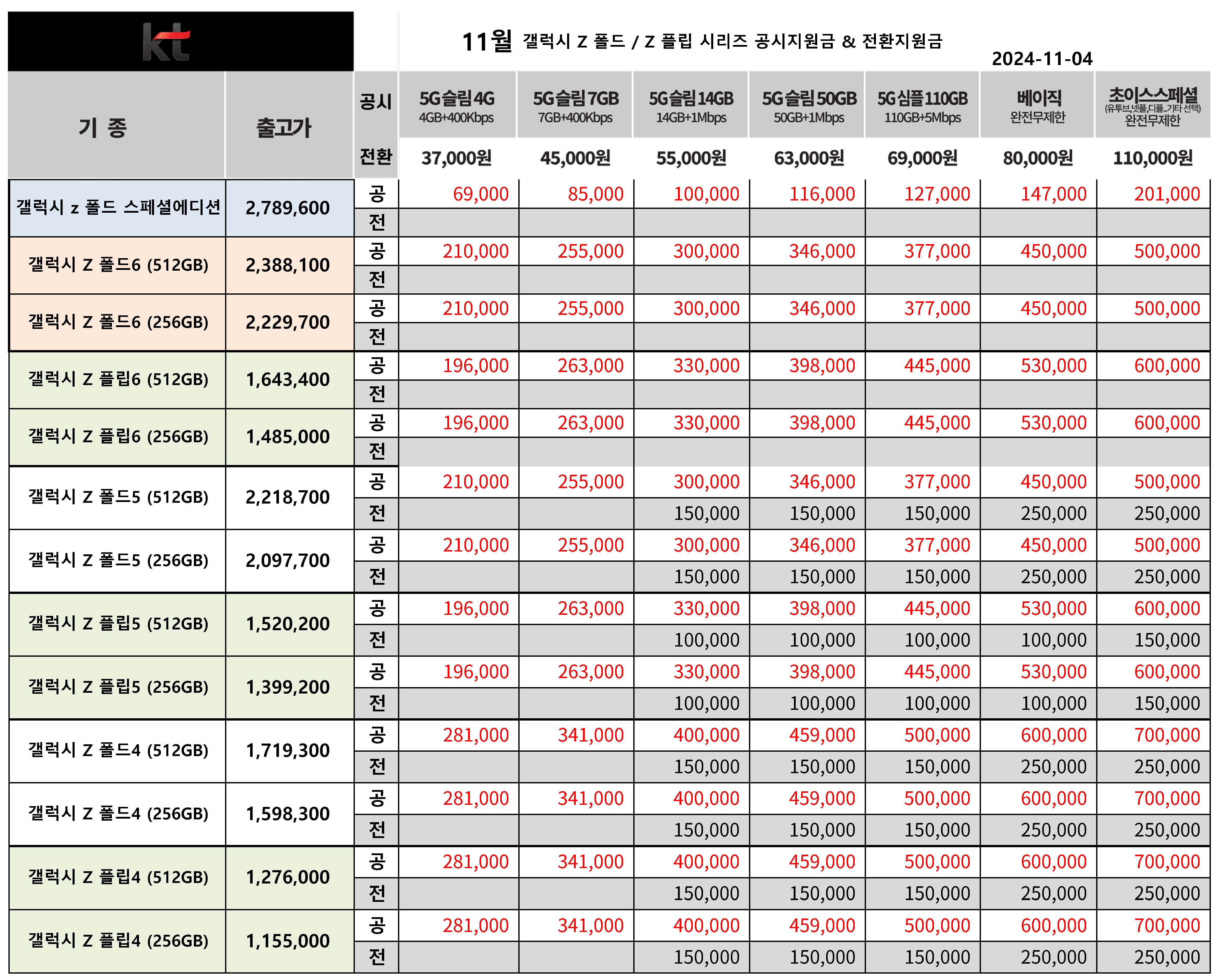 11월 KT 갤럭시 Z폴드6, 5, 4 출고가 & 공시지원금 / 갤럭시 Z 플립6, 5, 4 출고가 & 공시지원금