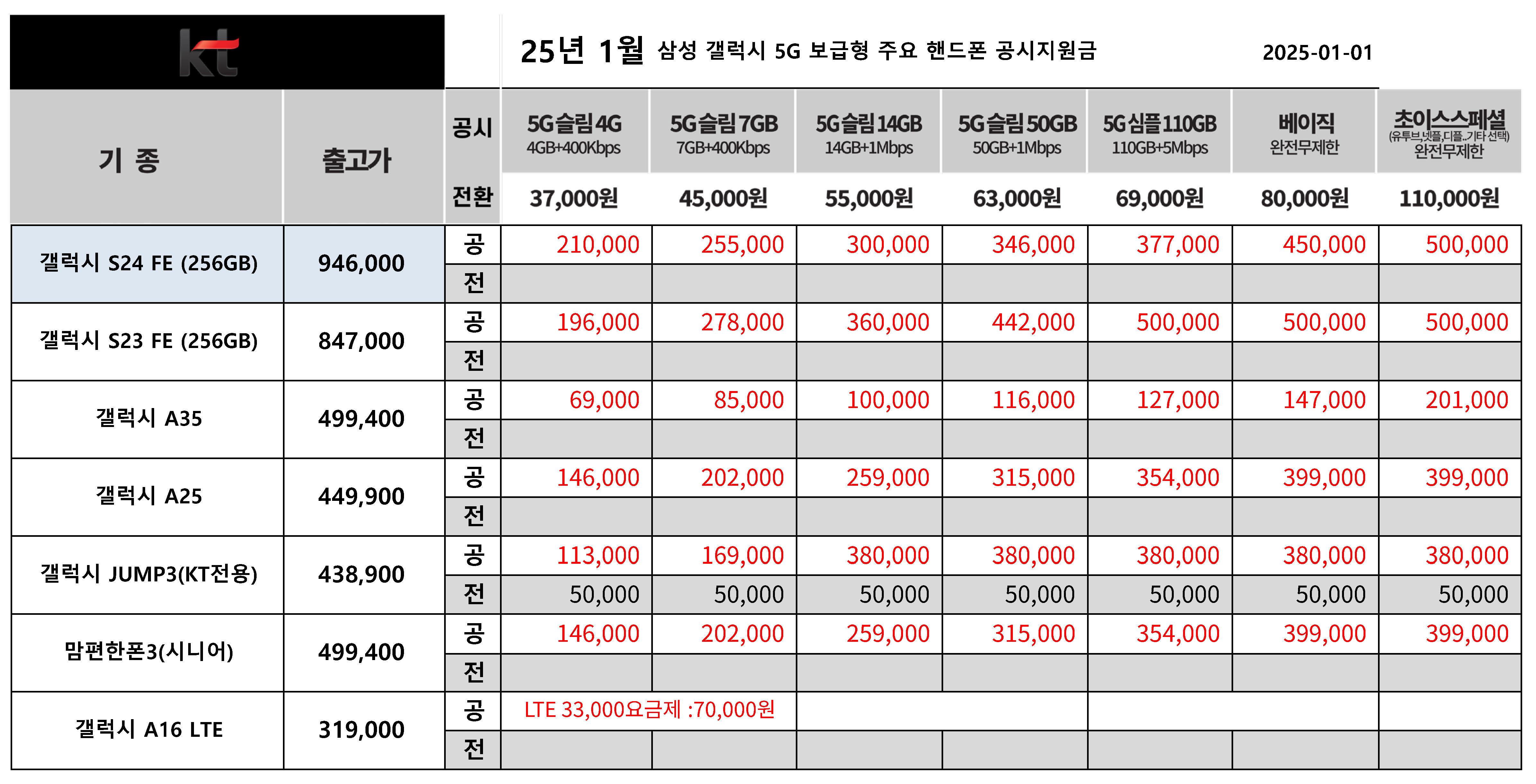 25년 1월 KT 갤럭시  보급형 시리즈  공시지원금