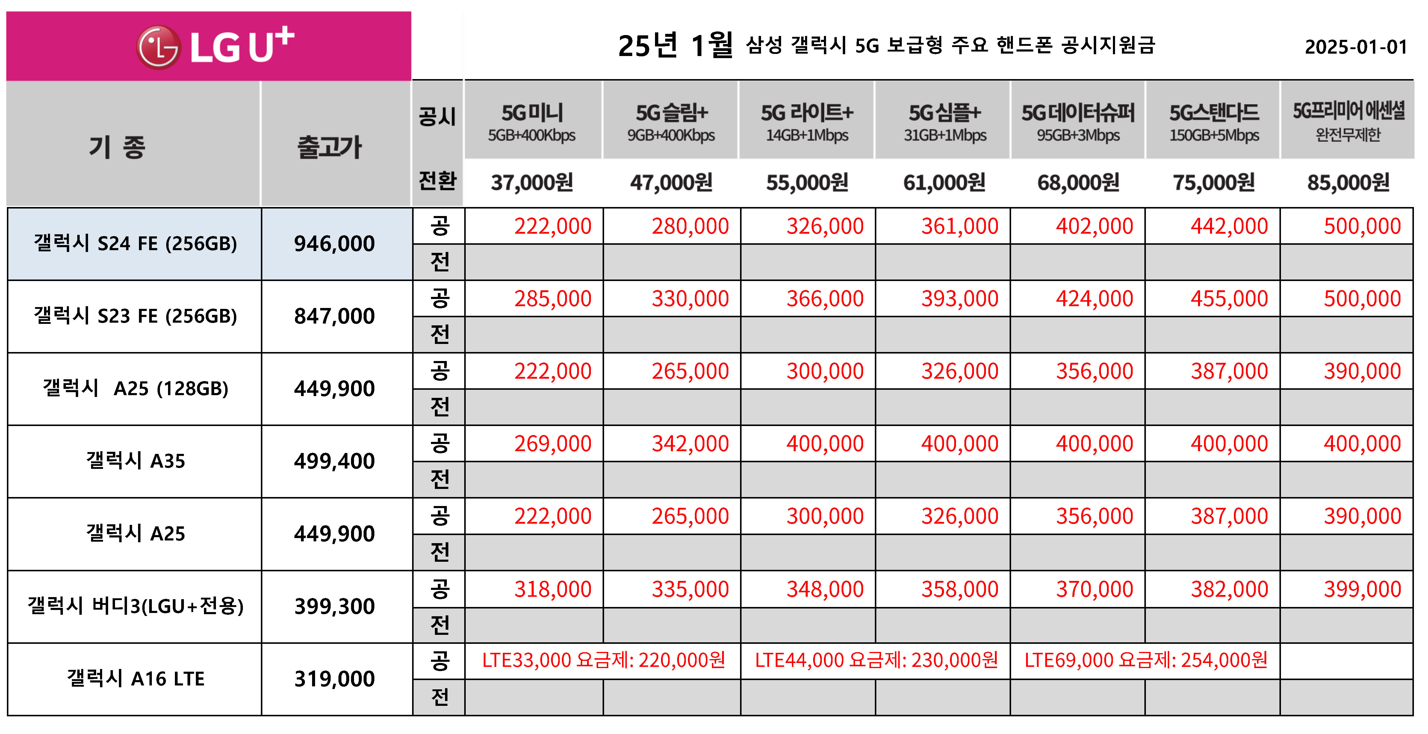 25년 1월 LG 유플러스 핸드폰 공시지원금 정리
