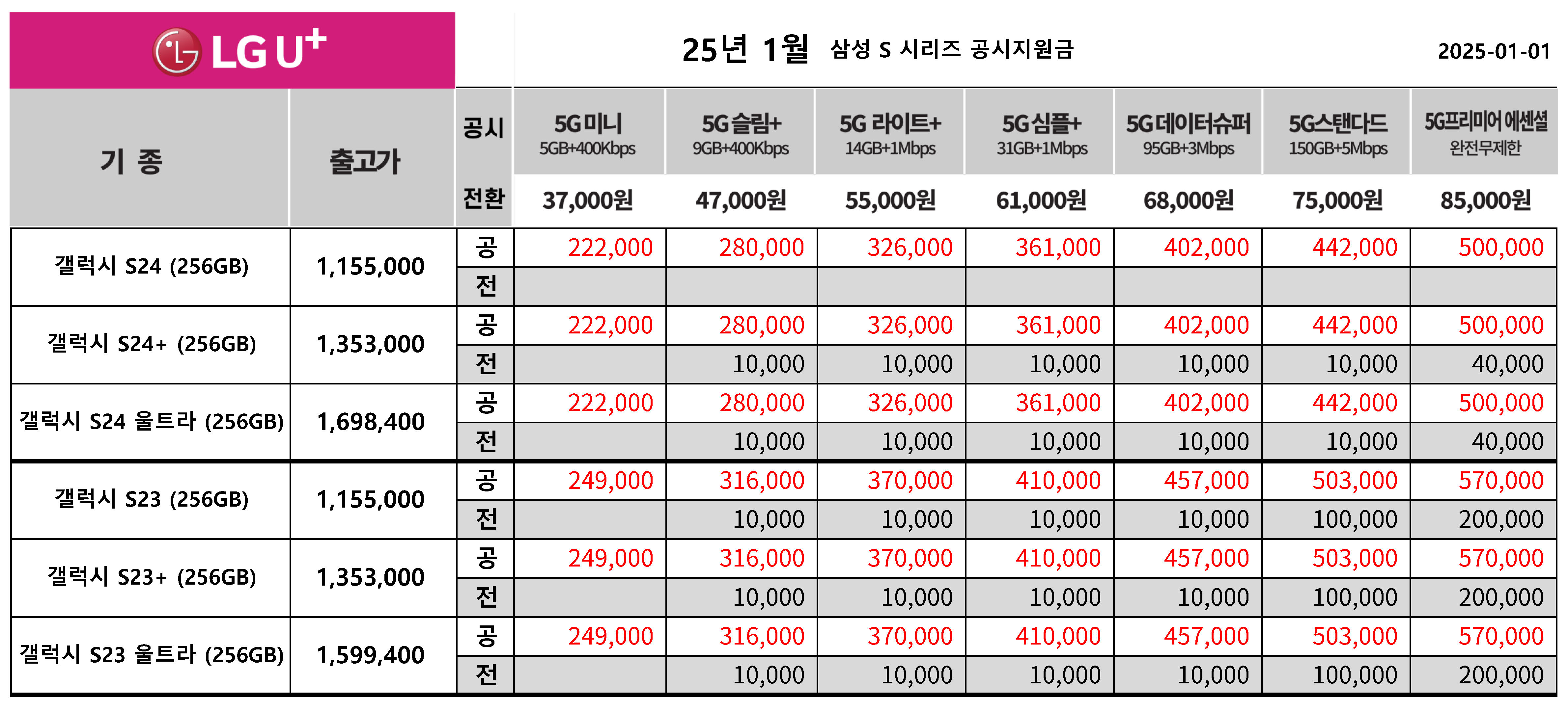 25년 1월 LG 유플러스 갤럭시 S24, S23 시리즈 공시지원금